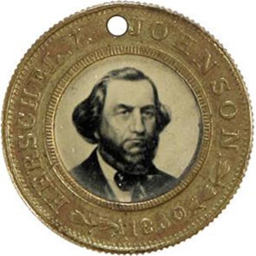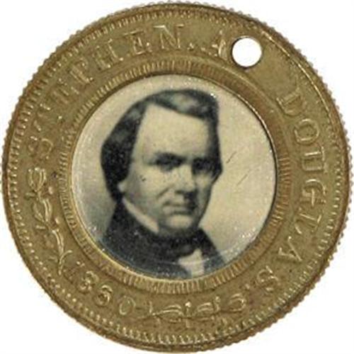 <B>Handsome Douglas and Johnson Campaign Ferrotype.</B></I> A 25mm. solid brass political from 1860, a back-to-back medal for the Little Giant Stephen Douglas and his running mate Herschel V. Johnson, one of four tickets to run that year. Very little age, spotting, or emulsion loss; stands out as being quite bright. Holed at top for suspension, this specimen is really quite impressive.<BR><BR><b>Shipping:</b> Miscellaneous Collectibles, Smal (<a target="_blank" href="http://www.heritageauctions.com/common/shipping.php">view shipping information</a>)
