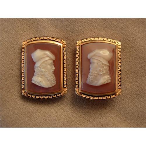 Handsome hardstone cameo and yellow gold cufflinks each set with one hardstone cameo of a "Kindly Bearded Gentlemen in Profile) rendered in brown/white bezel set into a 14kt yellow gold frame with engraved gold and elaborate black enamel details (one cameo's nose slightly smaller than the other's nose) - Button style back Maker's Mark - Bailey & Co. Fantastic Set of cufflinks