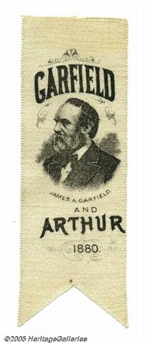 <B>Handsome James Garfield Campaign Ribbon</B></I> An exceptionally bright and clean example, not listed in Sullivan and Fischer, black on white silk, 5" in length. One tiny spot at very bottom of "V" cut. 1880 ribbons are considered somewhat scarce; this is a fine specimen for the candidate who served but a short term before being felled by an assassin's bullet. Lot:259