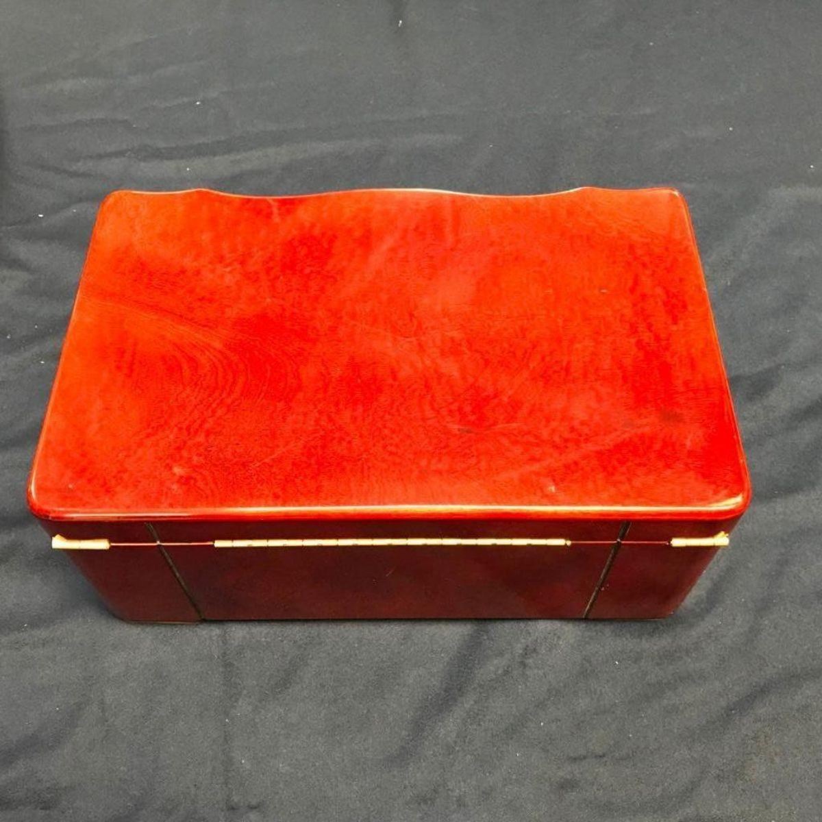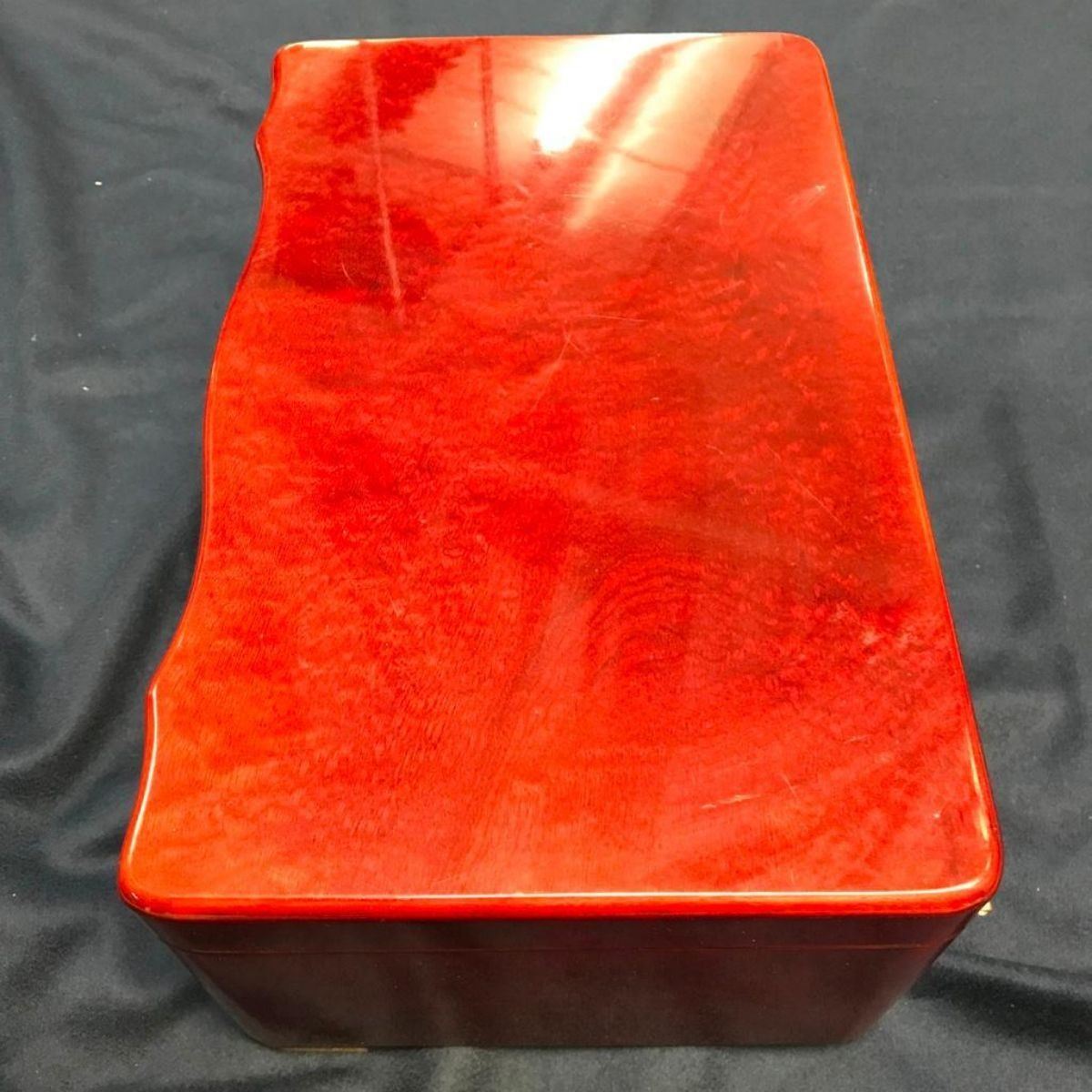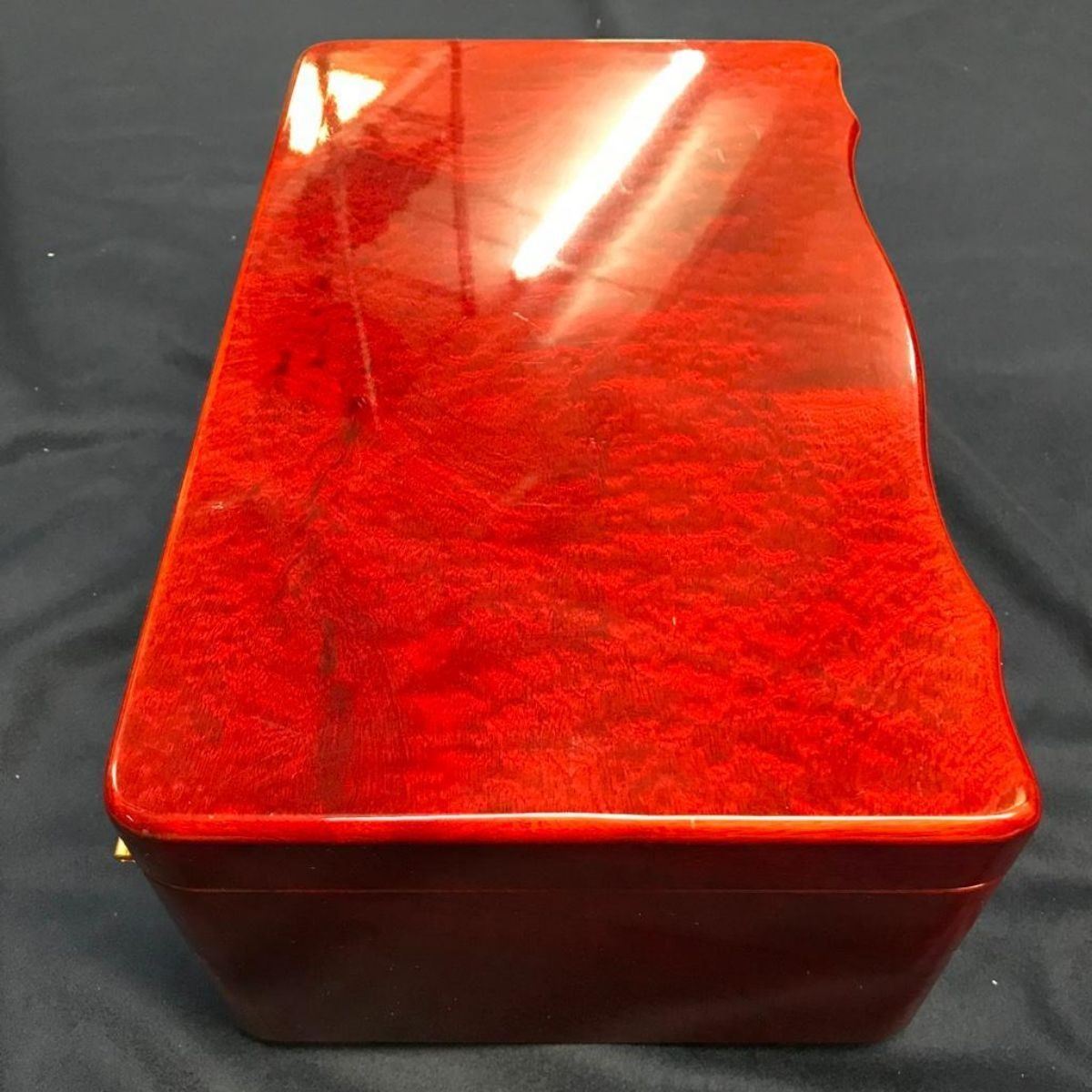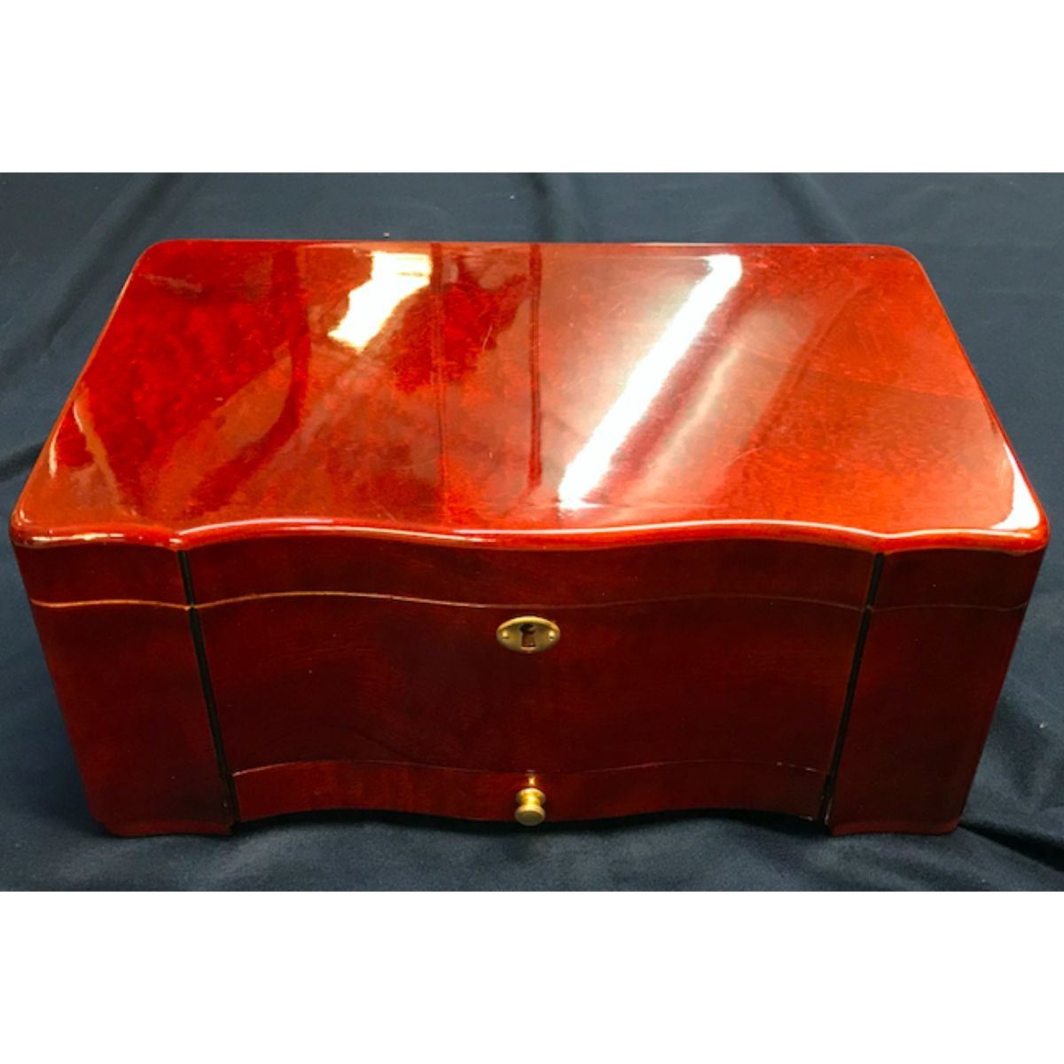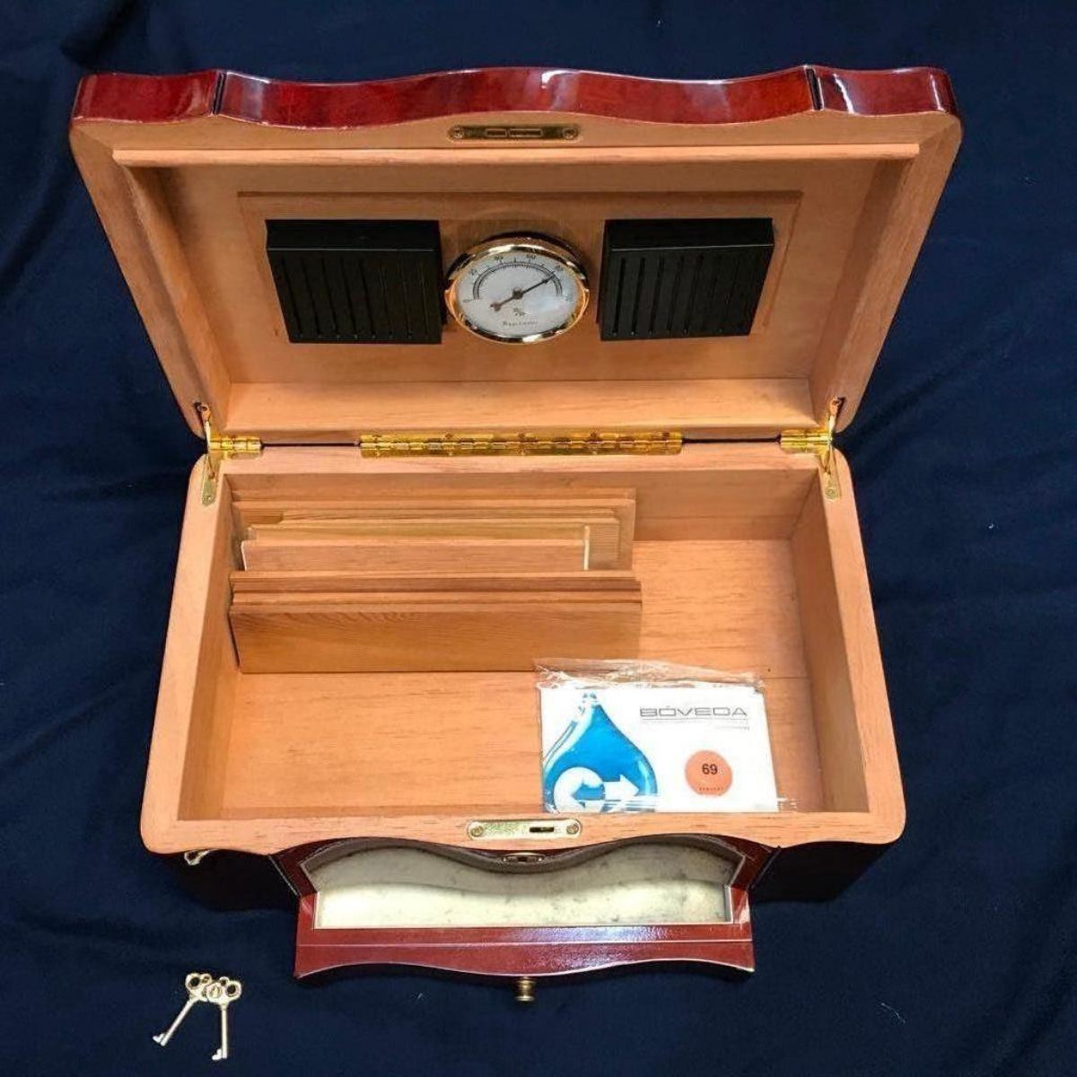 Handsome lacquered rosewood gentlemen's room humidor. Hygrometer, dividers, separate drawer & 2 keys. 15" W X 9 1/2" L X 7" H.Â
