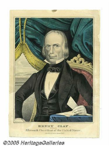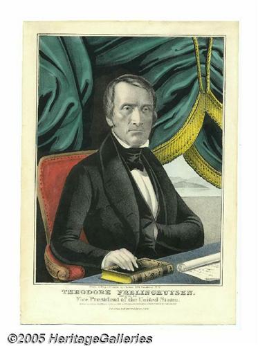 <B>Handsome Pair of Campaign Prints for Henry Clay and Theodore Frelinghuysen</B></I> 10" x 14" hand-colored small folio lithograph published by Nathaniel Currier in 1844, titled "Henry Clay, Nominated For Eleventh President of the United States." Clay is seen in the presidential chair, beneath tasseled draperies, clutching some letters. Colors are vibrant, including emerald, yellow, rose and blue. Some border tears and loss expertly and imperceptibly repaired. Overall appearence is excellent with strong presence. Sold together with the matching print (rarely seen!) of his Vice Presidential runningmate. It is titled "Theodore Frelinghuysen, Nominated for Vice President of the United States. From a Daguerreotype by Chilton." The colors on this one are lavish and vibrant! These are an exact pair and rarely offered as such. Condition on the Frelinghuysen is mint. Frame these up and you have something really nice! Lot:256