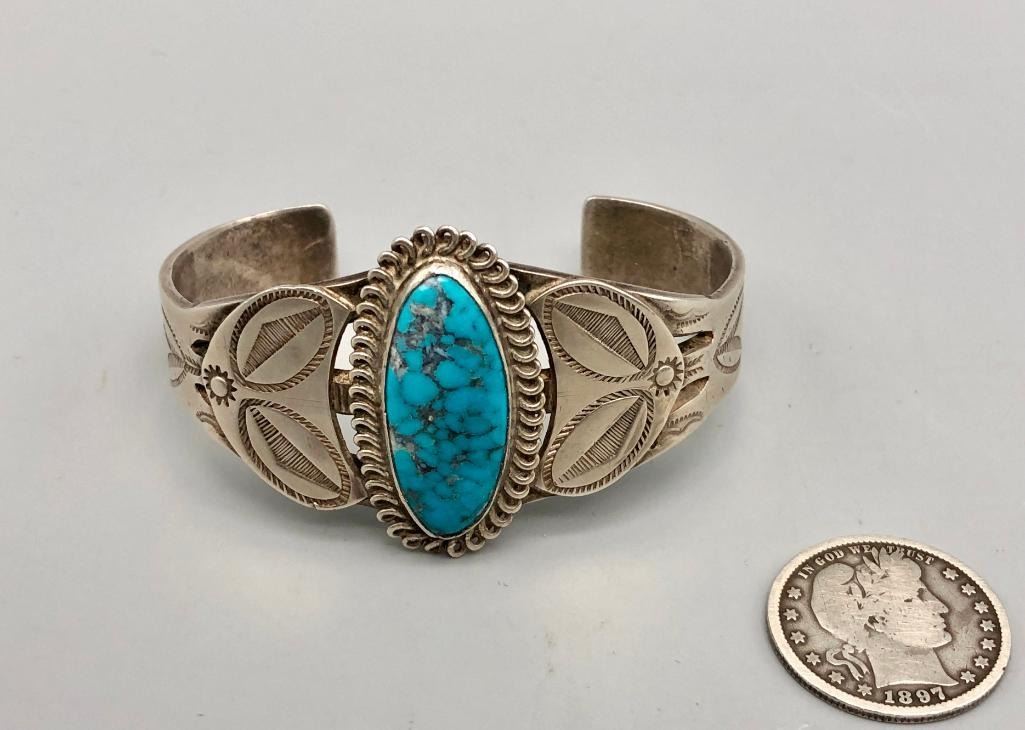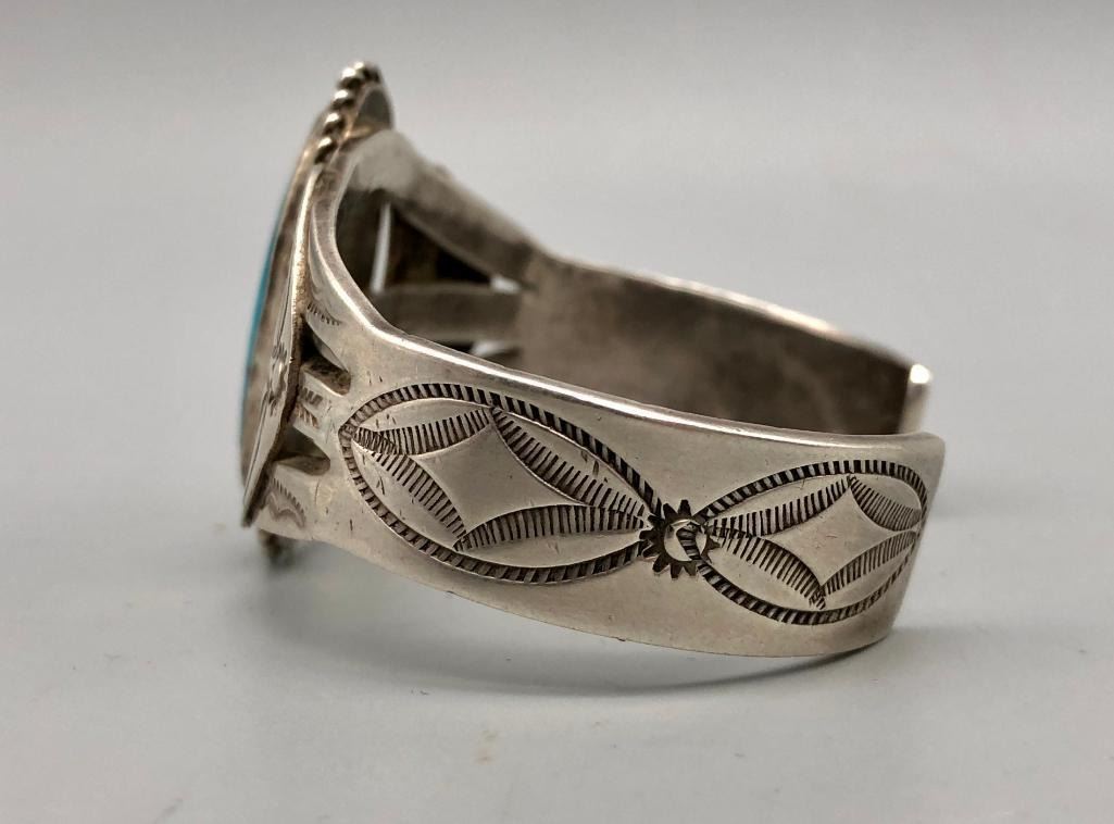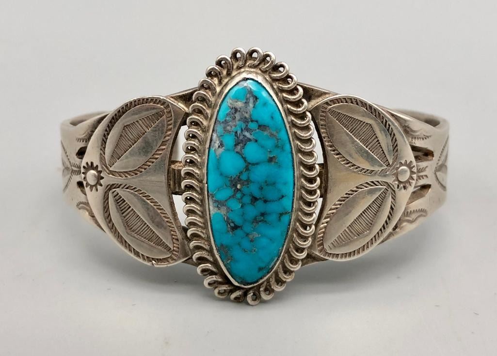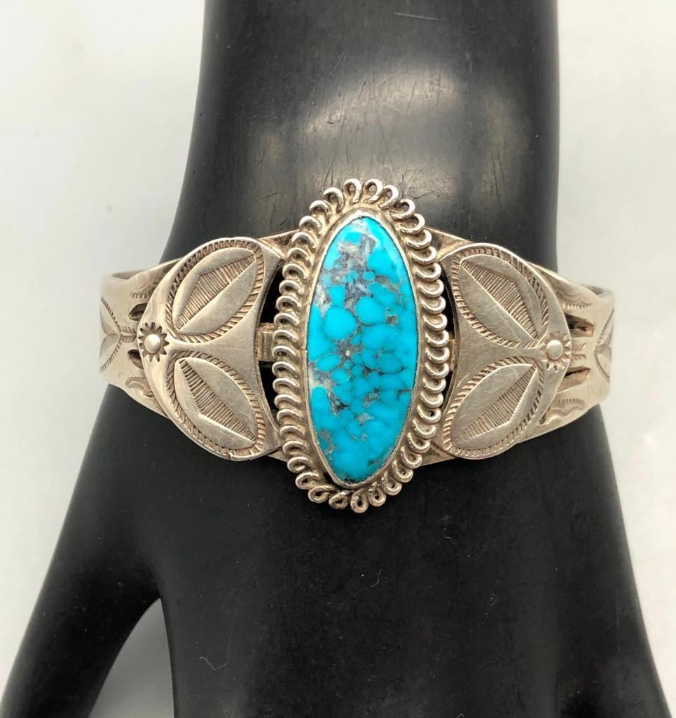 Offered for sale in this lot is a handsomely handmade turquoise bracelet. This is a fabulous bracelet set with a bright turquoise stone with a silver loop accent around it. It has a split shank style cuff with hand stamped designs and plates. This bracelet has a great sturdy feel and is made from sterling silver. MAKER: Unmarked. APPROX AGE: Circa 1960s. SIZE: Inside circumference measures 5-3/8 inches long. Opening is an additional 1-1/8 inches, fitting a 6-1/2 inch wrist. Width is 1-1/2 inches. Weighs 45.5 grams. CONDITION: Good for its age, normal wear expected. Please look closely at the pictures as they are an important part of our description and are hereby incorporated into the description, specifically with regards to condition. SHIPPING: There will be a $5 handling / packaging fee for shipping this lot. The actual cost of postage will be added on top of that. BUY IT NOW: If you would like to buy this item now, without waiting for the auction day to bid on it, we do offer this option (which is available up to 48 hours before the actual auction starts). The “Buy it Now†price is the high estimate of this lot (plus applicable fees and the Buyer's premium is discounted to 10% when using the Buy it Now option). If you would like to exercise this option, you must contact us by email (or phone as long as you talk to someone live). Reference this lot number and your intention to "Buy it Now."