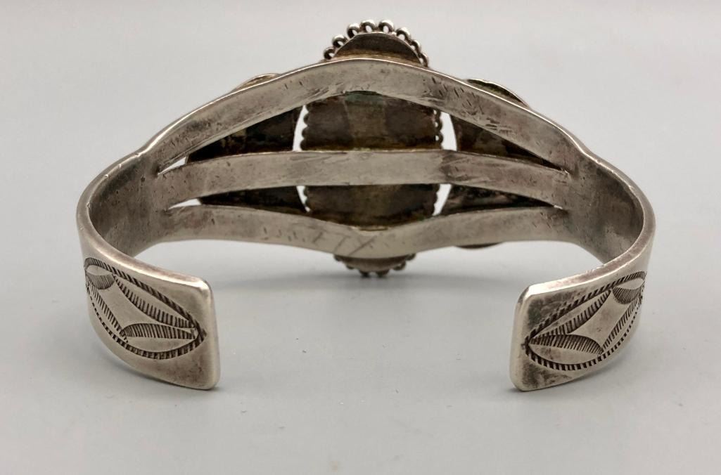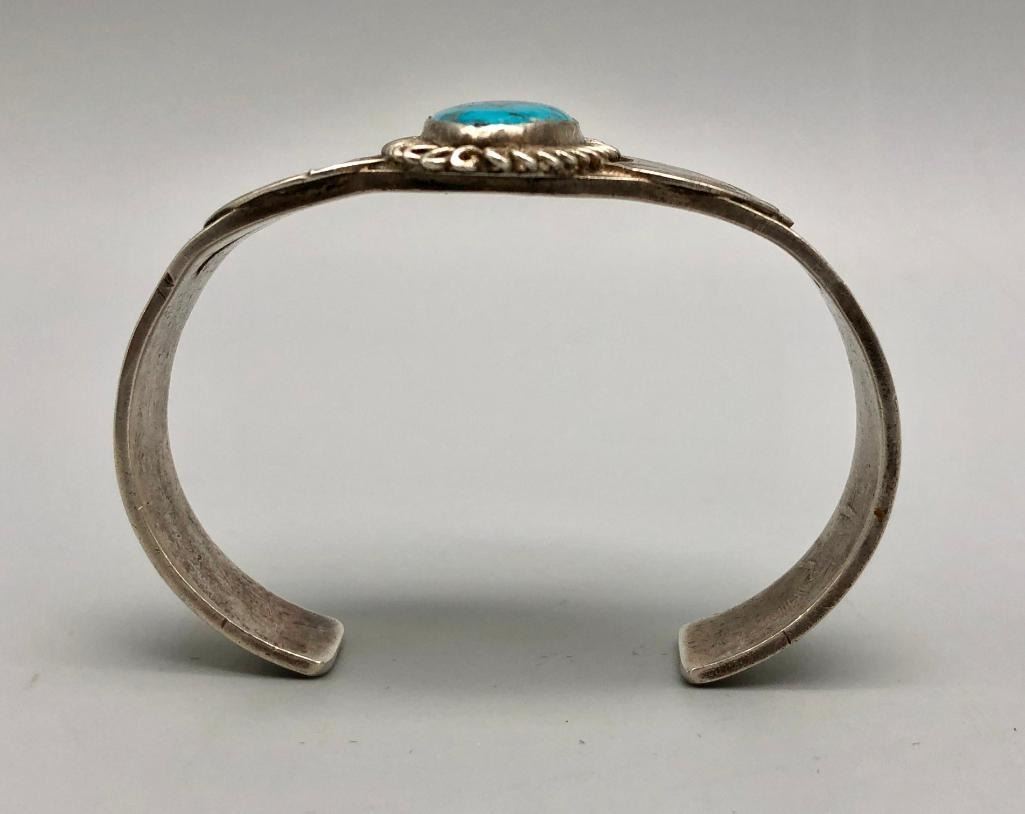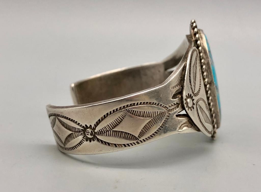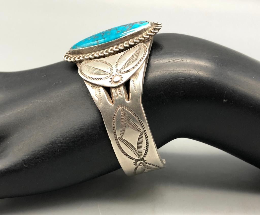 Offered for sale in this lot is a handsomely handmade turquoise bracelet. This is a fabulous bracelet set with a bright turquoise stone with a silver loop accent around it. It has a split shank style cuff with hand stamped designs and plates. This bracelet has a great sturdy feel and is made from sterling silver. MAKER: Unmarked. APPROX AGE: Circa 1960s. SIZE: Inside circumference measures 5-3/8 inches long. Opening is an additional 1-1/8 inches, fitting a 6-1/2 inch wrist. Width is 1-1/2 inches. Weighs 45.5 grams. CONDITION: Good for its age, normal wear expected. Please look closely at the pictures as they are an important part of our description and are hereby incorporated into the description, specifically with regards to condition. SHIPPING: There will be a $5 handling / packaging fee for shipping this lot. The actual cost of postage will be added on top of that. BUY IT NOW: If you would like to buy this item now, without waiting for the auction day to bid on it, we do offer this option (which is available up to 48 hours before the actual auction starts). The “Buy it Now†price is the high estimate of this lot (plus applicable fees and the Buyer's premium is discounted to 10% when using the Buy it Now option). If you would like to exercise this option, you must contact us by email (or phone as long as you talk to someone live). Reference this lot number and your intention to "Buy it Now."