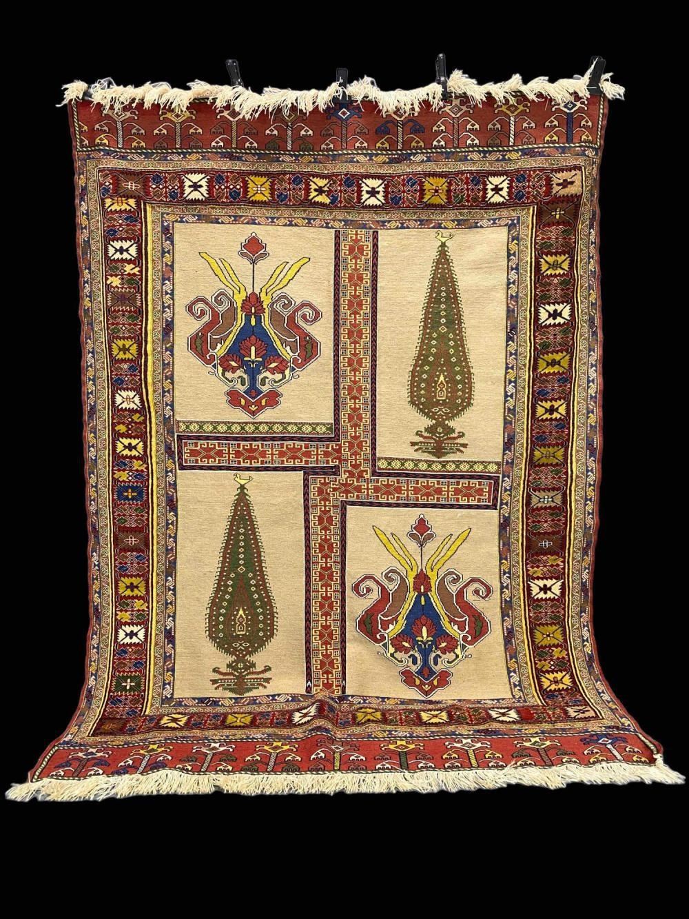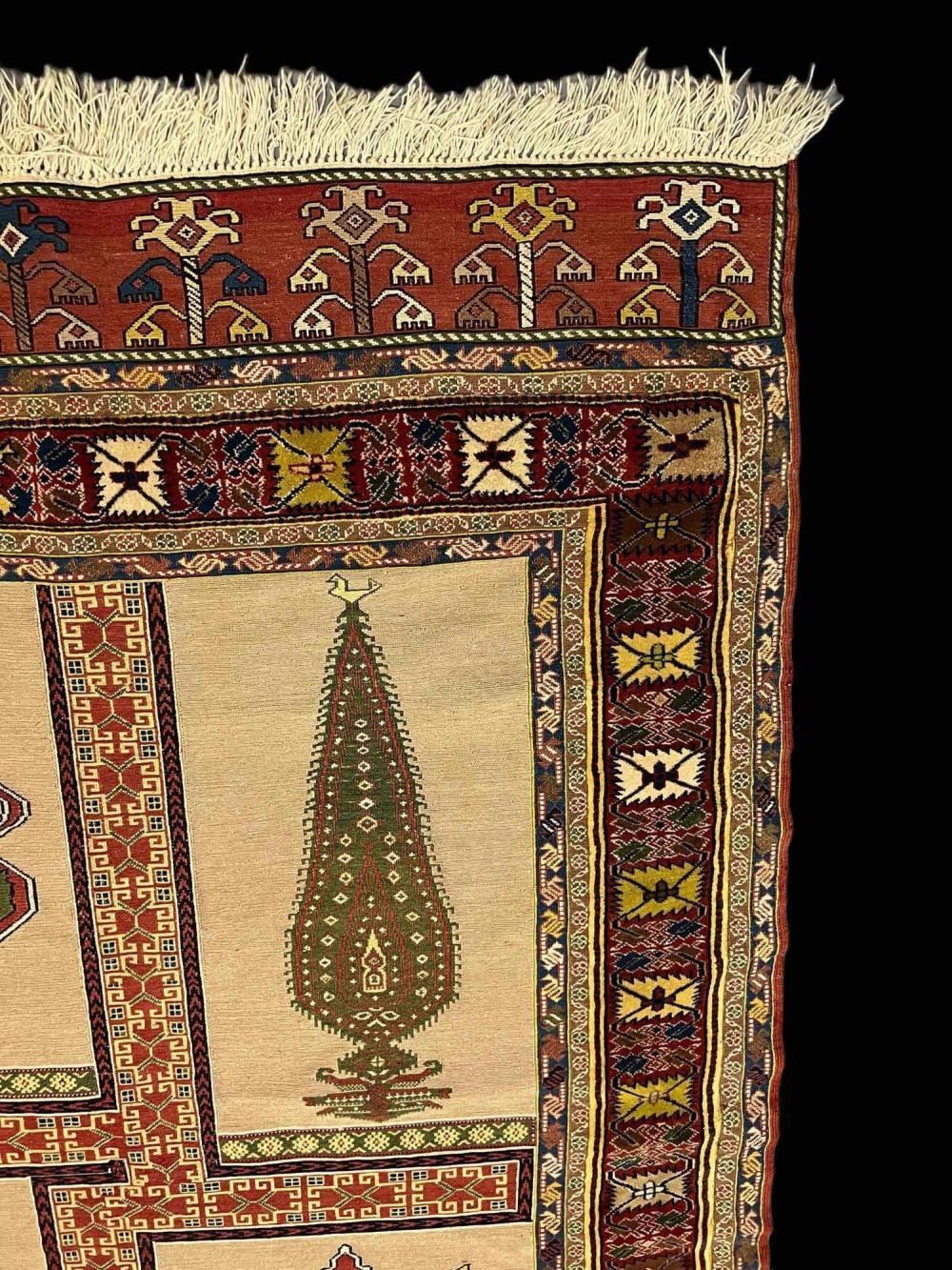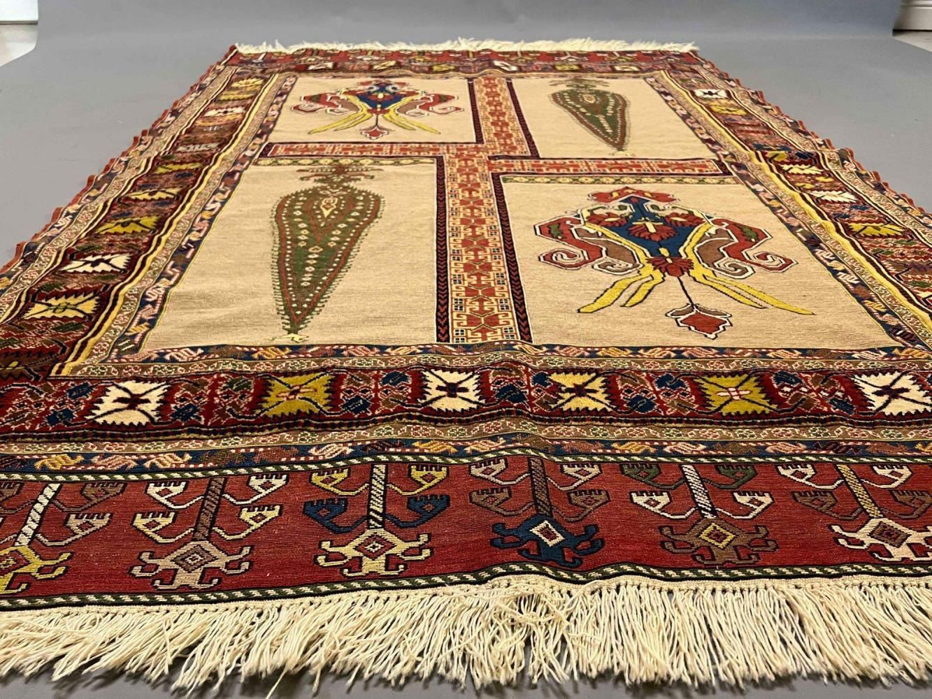 Handwoven Turkish Tribal Kilim Rug. Approximately 83.5 L x 60.5 W Inches.
