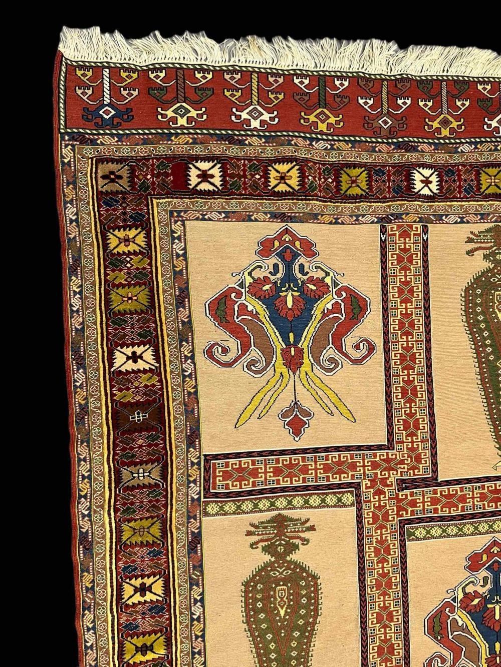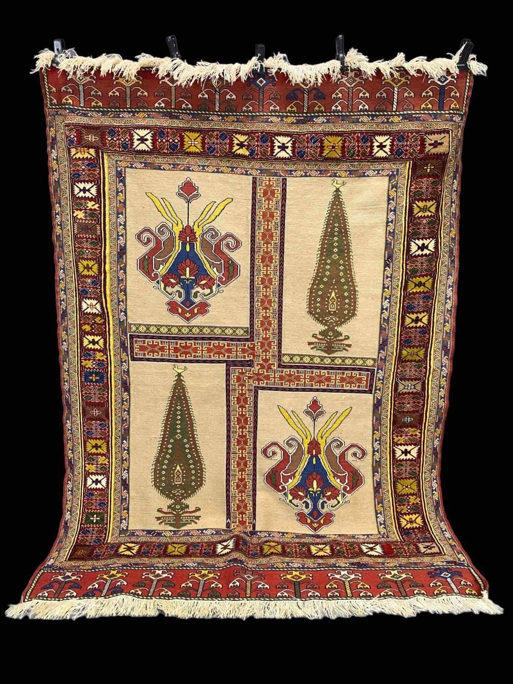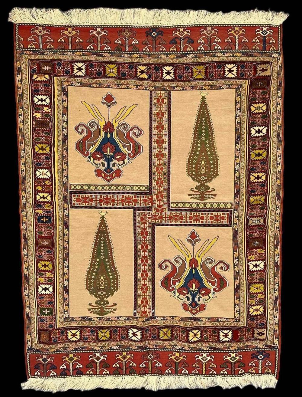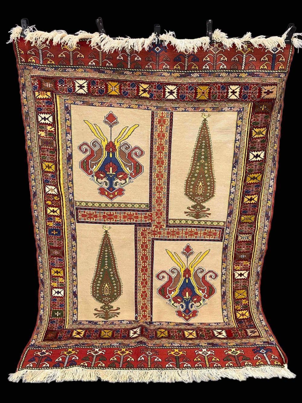 Handwoven Turkish Tribal Kilim Rug. Approximately 83.5 L x 60.5 W Inches.