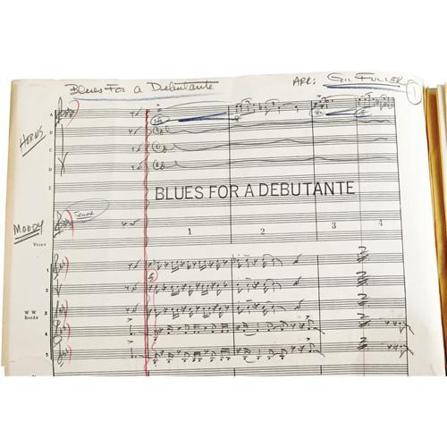 <B>Handwritten Gil Fuller Sheet Music.</B></I> Perhaps Fuller's most famous recording was with James Moody on the album <I>James Moody and Monterrey Jazz Orchestra.</B></I> This historic album featured the great saxophonist, who performed beside Dizzy Gillespie for most of his great career. One of the most impressive cuts on the album was "Blues for a Debutante," a compelling and swinging composition that allowed Moody to show his musical prowess. Among the items in this archive is the complete, original score for "Debutante," handwritten by Fuller. For the Jazz collector, this is a true treasure long thought lost. In Very Fine condition with mild wear and tanning.