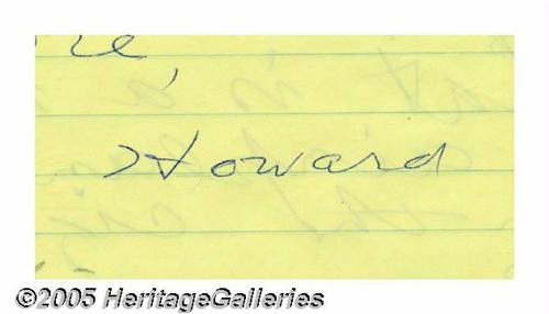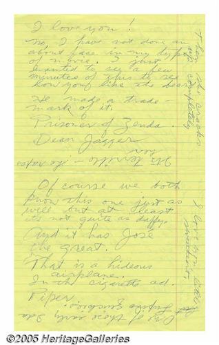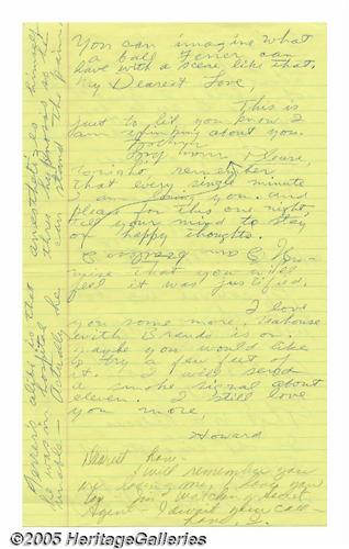 <B>Handwritten Howard Hughes' Note to Wife Jean Peters</B></I> Hughes and his wife had an interesting relationship - separate rooms and communication by handwritten memos. Well, we guess it worked for them (for a few years anyway). Here is an interesting example of their messages to one another. On a lined yellow legal-sized page, undated, Hughes writes: <I>"My Dearest Love, This is just to let you know that I am thinking about you. Please, tonight, remember that every single minute I am loving you. And please for this one night, tell your mind to stay on happy thoughts. I promise that you will feel it was justified. I love you some more. Teahouse with Brando is on. Maybe you would like to try a few feet of it. I will send a smoke signal about eleven. I still love you more, Howard."</B></I> No doubt, his reference is to <I>The Teahouse of the August Moon</B></I> (1956) which starred Marlon Brando. Howard Hughes was really a fan of old movies, even to the point of buying TV stations where he lived to guarantee that at least one station would stay on late showing vintage films. Jean Peters replies: <I>"Dearest Love - I will remember you are loving me. I love you too. I'm watching Secret Agent - I await your call - Love J."</B></I> As usual, the rest of the writing is by Hughes and it bounces around as to subject matter. At least a few of these notes are about Jose Ferrer, but one particular sentence is attention-getting. Written upside down inside his first message, Hughes writes: <I>"If I am boatless, I may kill myself."</B></I> A large amount of writing in Howard Hughes hand, a first-name signature, a movie review, a love letter to his wife and more. This item really needs to be in <I>your</B></I> collection. Fine condition. <I>Accompanied by COA from PSA/DNA.</B></I> Lot:254
