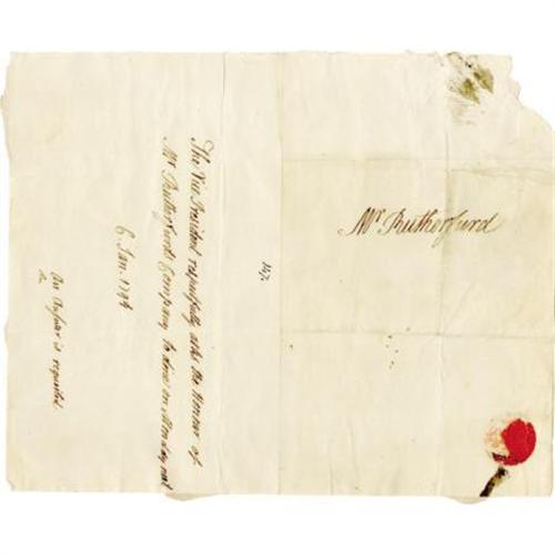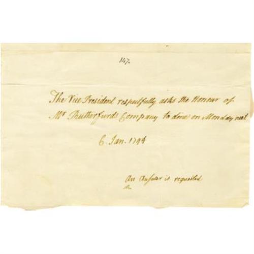 <B>A Handwritten Invitation by Vice President John Adams</B></I> ANS in the third person, one page, 8" x 10" folded in half, "<I>Jan. 1794</B></I>", to a "<I>Mr. Rutherfurd</B></I>". Adams writes in full: "<I>The Vice President respectfully asks the Honour of Mr. Rutherfurds Company to dine on Monday next / 6. Jan. 1794 / An answer is requested.</B></I>" Paper loss at top left corner, where wax seal was removed, but well away from Adams' holograph. Mounting remnants to verso, otherwise very clean with bold ink.<BR><BR><b>Shipping:</b> Flat Material, Small (<a target="_blank" href="http://www.heritageauctions.com/common/shipping.php">view shipping information</a>)