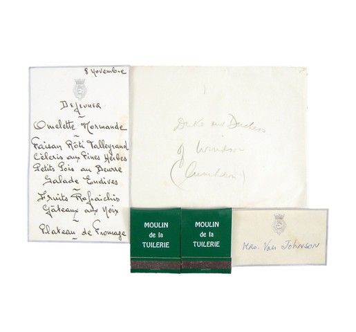 Hand-Written Menu For A Luncheon At Duke & Duchess Of Winsor Estate - A rare and wonderful piece of history. "Le Moulin de la Tuilerie" was the former weekend home of Edward, Duke of Windsor and his wife, Wallis Simpson. Theirs was one of the greatest love stories of the 20th Century, when in 1936, Edward VIII renounced his "Kingship" of the British throne in order to marry, Mrs. Simpson, an American Divorcee. Of course this caused his brother George to be forced into the position. King George VI was the "stuttering" King who not only didn't want the "job", but was terrified to speak in public. This was made famous in the 2010 Multi-Oscar winner (including Best Picture) "The King's Speech". However this rare set of items, are not from any movie, but from real life. They are two unused match boxes from the home of "Moulin de la Tuilerie", plus a hand written menu on the Windsor's official stationary, for a luncheon held at the famous estate in the 1950's and given by the Duke and Duchess of Winsor. The "Dejeuner" Menu and the matches were given to American matinee idol Van Johnson and his wife Evie, who attending this famous affair. it comes from his personal collection and includes a letter of Provenience from his daughter.