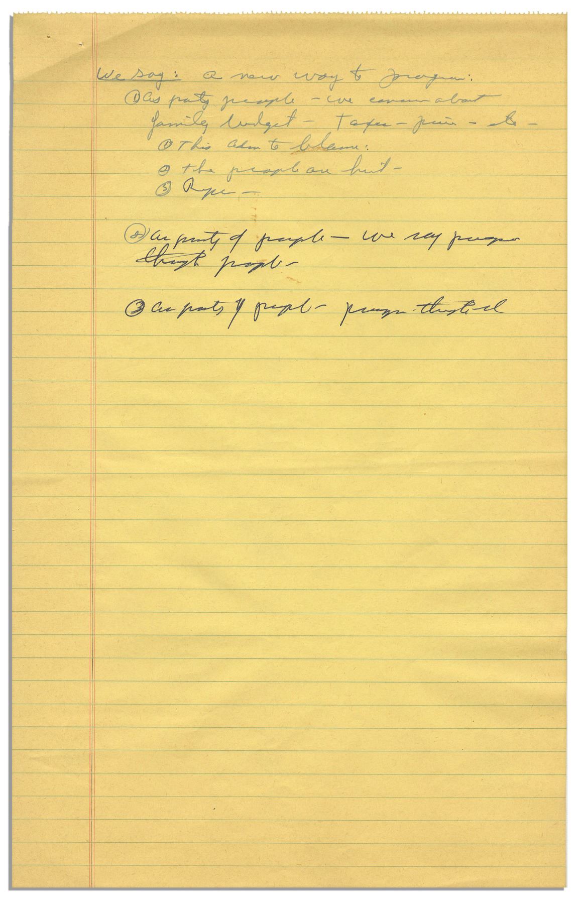 Handwritten note by Richard Nixon in August 1966 as a Presidential hopeful outlining his campaign themes. As Nixon prepares for the 1968 Presidential election, he writes, ''We say: A new way to progress: As party people we're concerned about family budget - taxes - prices - etc - This adm [Johnson administration] to blame / the people are hurt...'' He continues, ''...As party of people we say progress through people...'' Single-page document on a ruled sheet measures 8.5'' x 13.25''. Two staple punctures to top left. Near fine. From a larger collection of Nixon's handwritten notes from 1966.