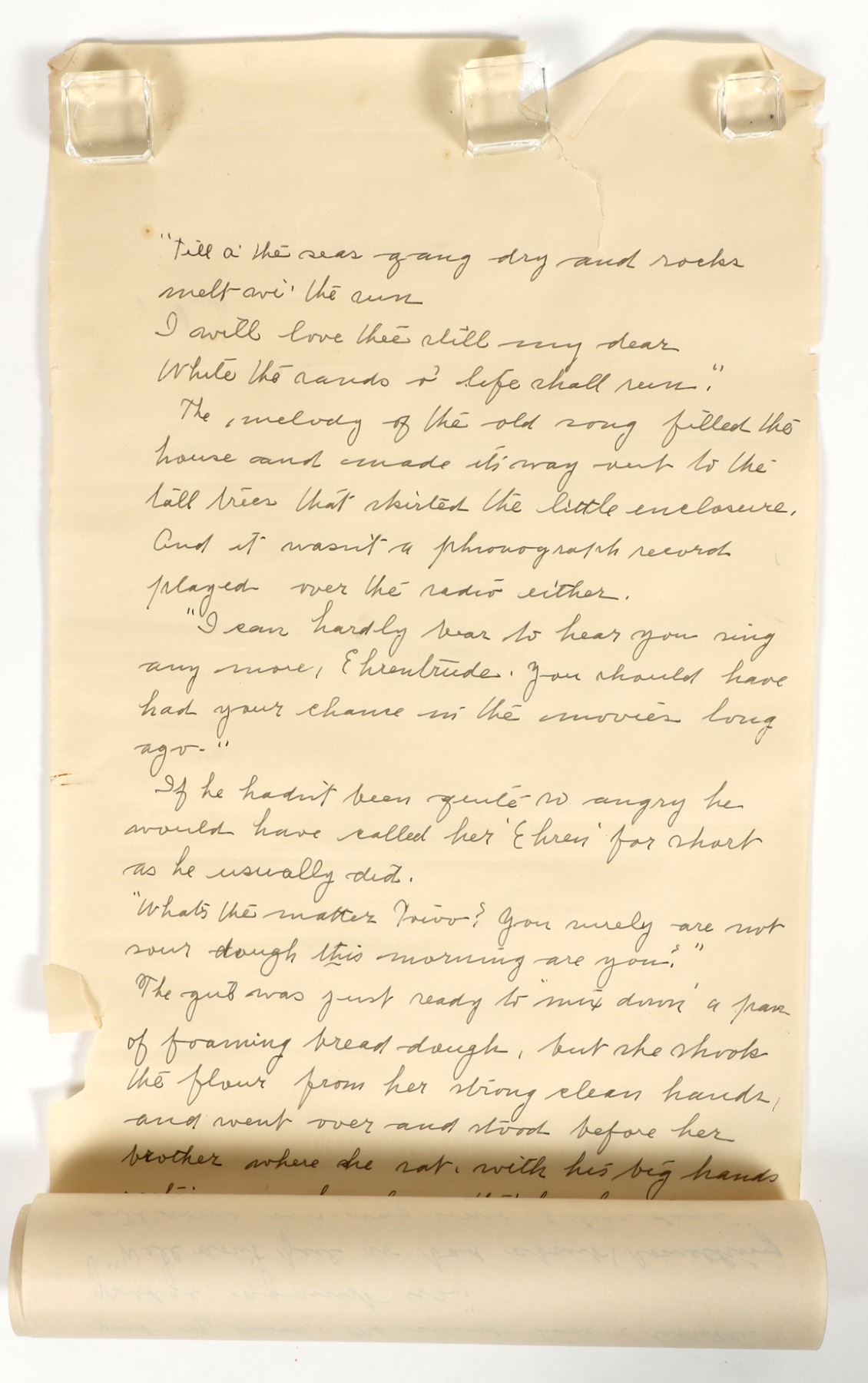 An untitled, handwritten play/story on a scroll. It is written like a play with opening scene in a kitchen. The characters at this point, a mother and son, discussing breakfast and getting ready for the day. The father in just outside of the kitchen. Let us know how it ends?