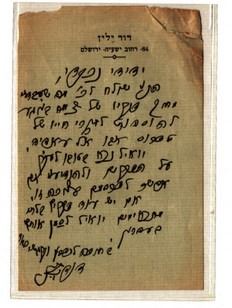 Handwritten and hand-signed letter by David Yellin, on his personal stationary, 84 Yeshaya St. Jerusalem, two upper corners are flawed, paper reasonably yellow. Dimensions: 9x14 cm.