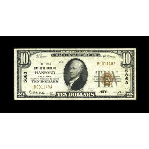 <B>Hanford, CA</B></I> - $10 1929 Ty. 1 <B>The First NB</B></I> Ch. # 5863<BR>An appealing <B>Very Fine</B></I> from this Kings County locale. Well margined and still retaining considerable crispness.<BR><BR><b>Shipping:</b> Coin/Currency (<a target="_blank" href="http://www.heritageauctions.com/common/shipping.php">view shipping information</a>)