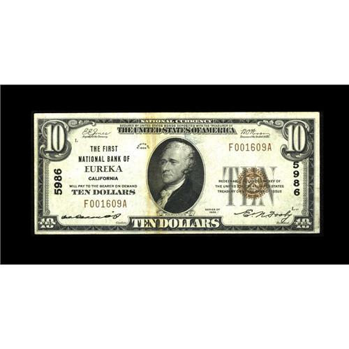 <B>Eureka, CA</B></I> - $10 1929 Ty. 1 <B>The First NB</B></I> Ch. # 5986<BR>A nice <B>Very Fine</B></I> that retains much of its original crispness.<BR><BR><b>Shipping:</b> Coin/Currency (<a target="_blank" href="http://www.heritageauctions.com/common/shipping.php">view shipping information</a>)