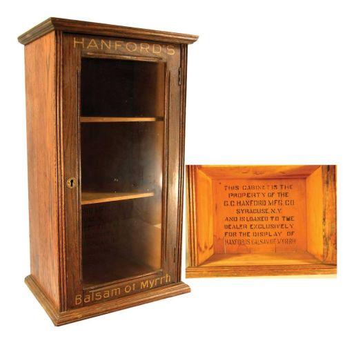 Hanfords Balsam of Myrrh Oak Store Display Cabinet, includes 3 wood shelves. Excellent condition. 14 X 24 1/2 X 9 1/2 inches.