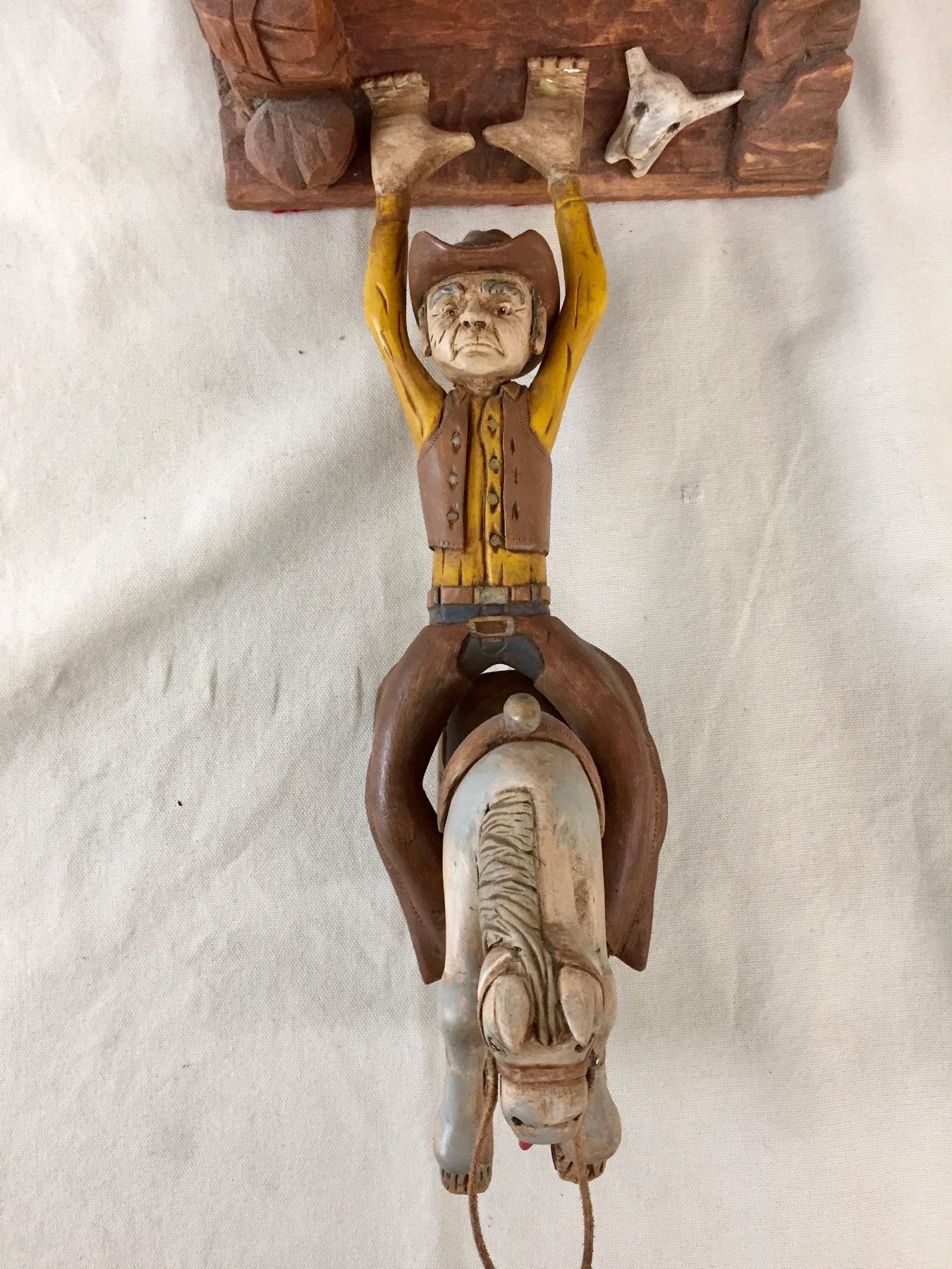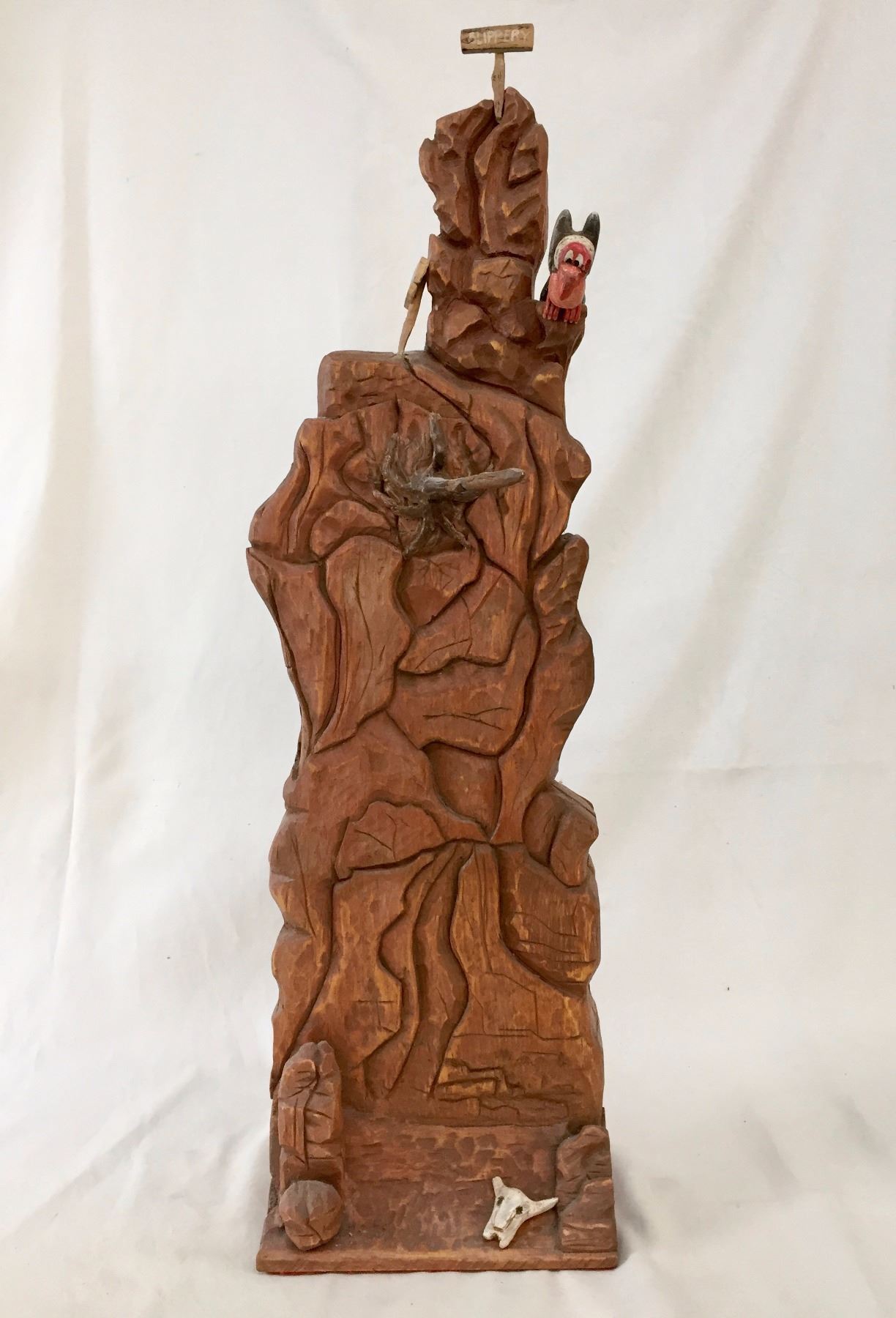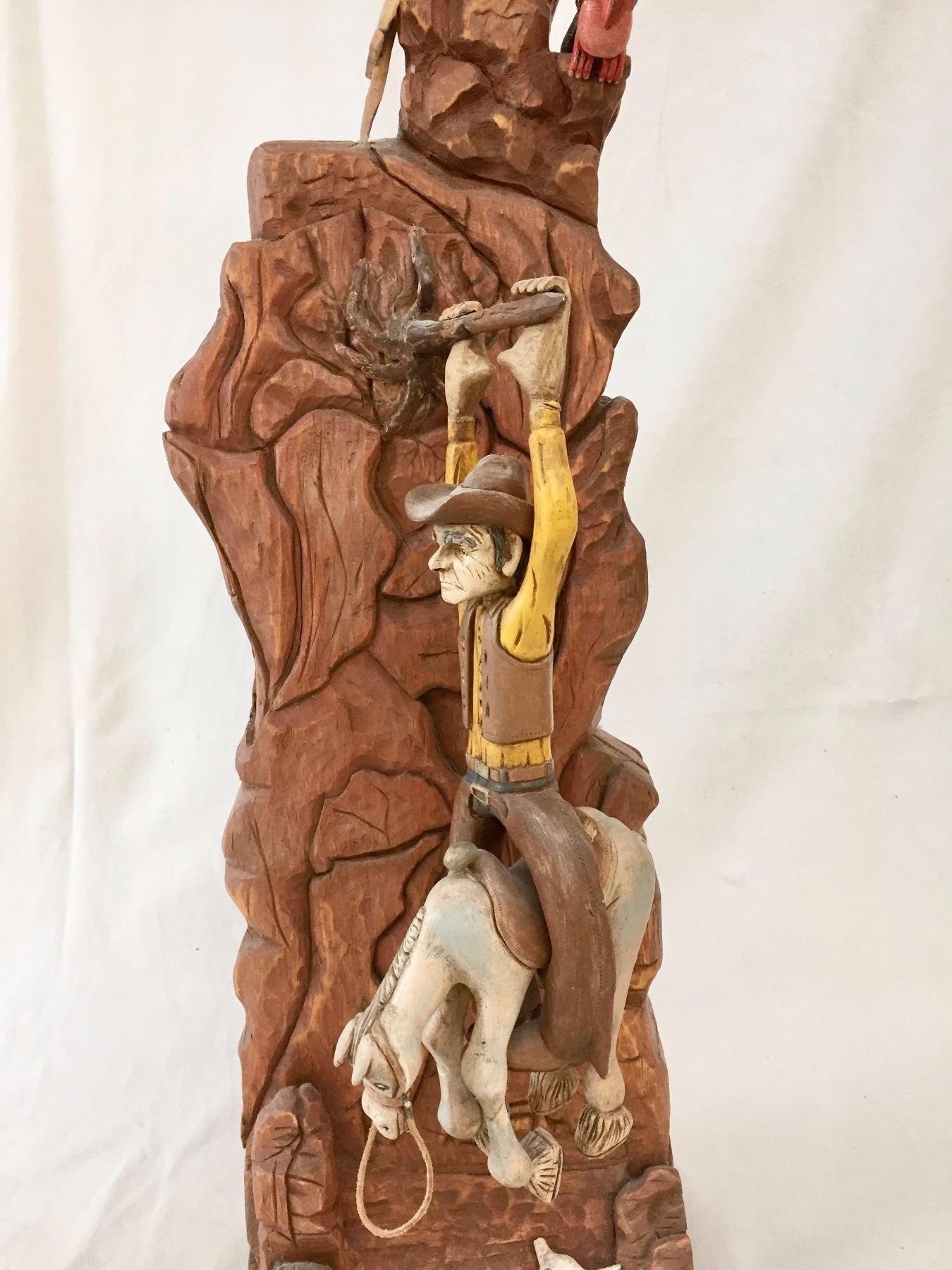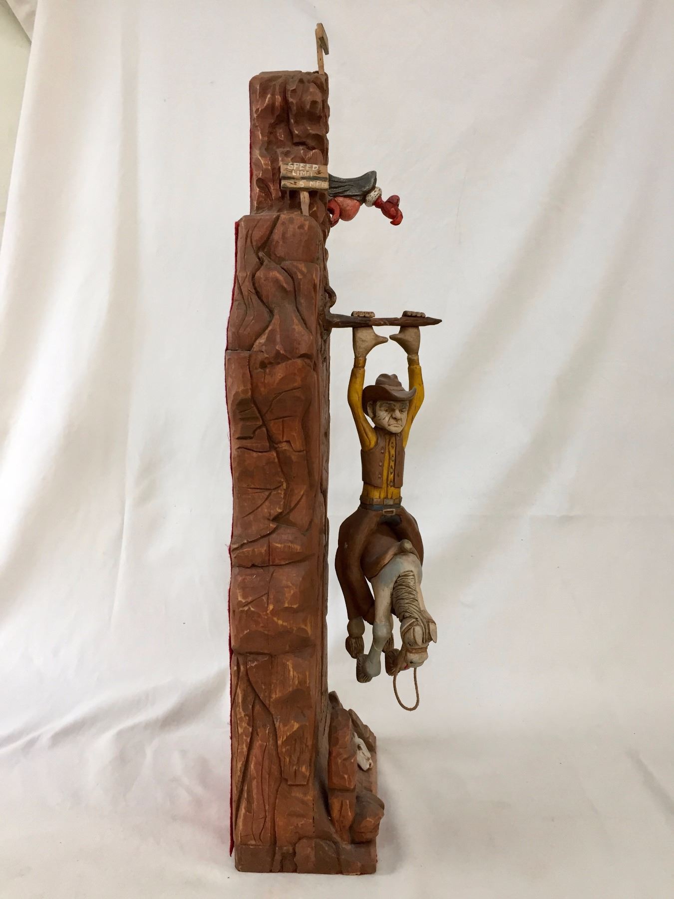 Description: Extremely detailed and slightly comical wood carving of a cowboy and his horse hanging from a tree limb after falling off the cliff. Maker: Looks like it says, G. Daily. Approx. Age: Dated 2/26/2008. Size: 8”w x 26” tall. Condition: Good for its age, normal wear expected. Please look closely at the pictures - they are an important part of our description. Shipping: There will be a $15 handling / packaging fee for shipping this lot. The actual cost of postage will be added on top of that.