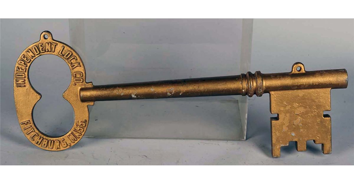 Oversize metal key advertising sign, marked Independent Lock Co. Fitchburg Mass, circa 1930's. Condition (Very good). Size 29" long