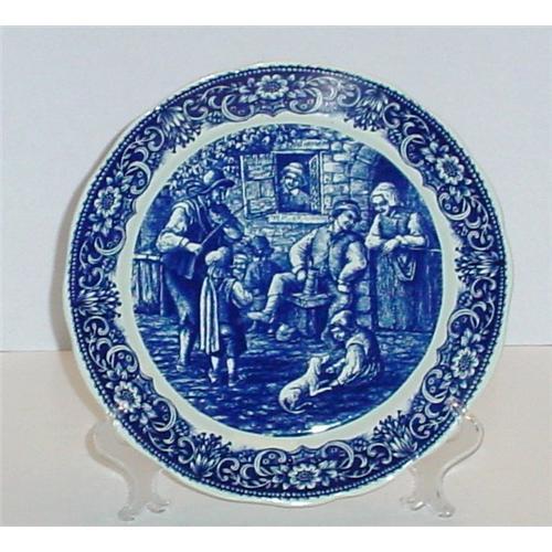 Hanging decorator plate in excellent condition. Back is marked "BOCH" "La Louvier" "Delft". This large (13.5") plate depicts a scene outside an Inn or tavern and is very detailed. This is a great transferware piece.