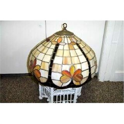 20" diameter leaded glass hanging lamp in multi colored glass. It is very pretty when lit. It has a tiny chip in one glass piece but no cracks.