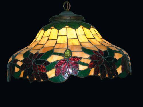 Hanging Leaded Glass Lamp, beautiful poinsettia motif. No chips or cracks. 11 inches tall X 23 inch dia.