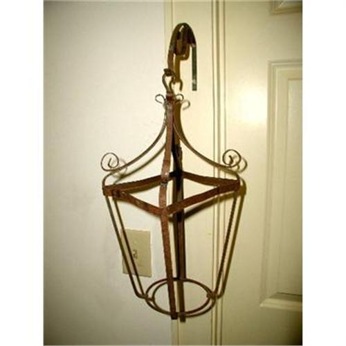 Italian 19th century metal lantern style garden hanging planter and scrolled support arm shows bits of the original verdigris color. The metal has aged nicely,darkening with time,completely intact without rust buildup and just as sturdy as ever. Cage detaches from arm to prune or water plant. Alsdo holds a large size candle with circular bottom support. Measures 16H X 7L X 7W with 8 inch extending arm.