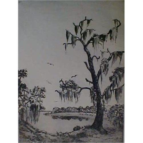 Roy Clark (unk). Titled Hanging Moss. Etching, edition unknown. Hinge mounted on archival board. Pencil signed as well as signed and dated in the print.