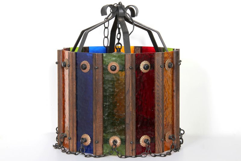 Hanging Multi-Color Lamp Fixture, Colored Glass and Painted Metal
