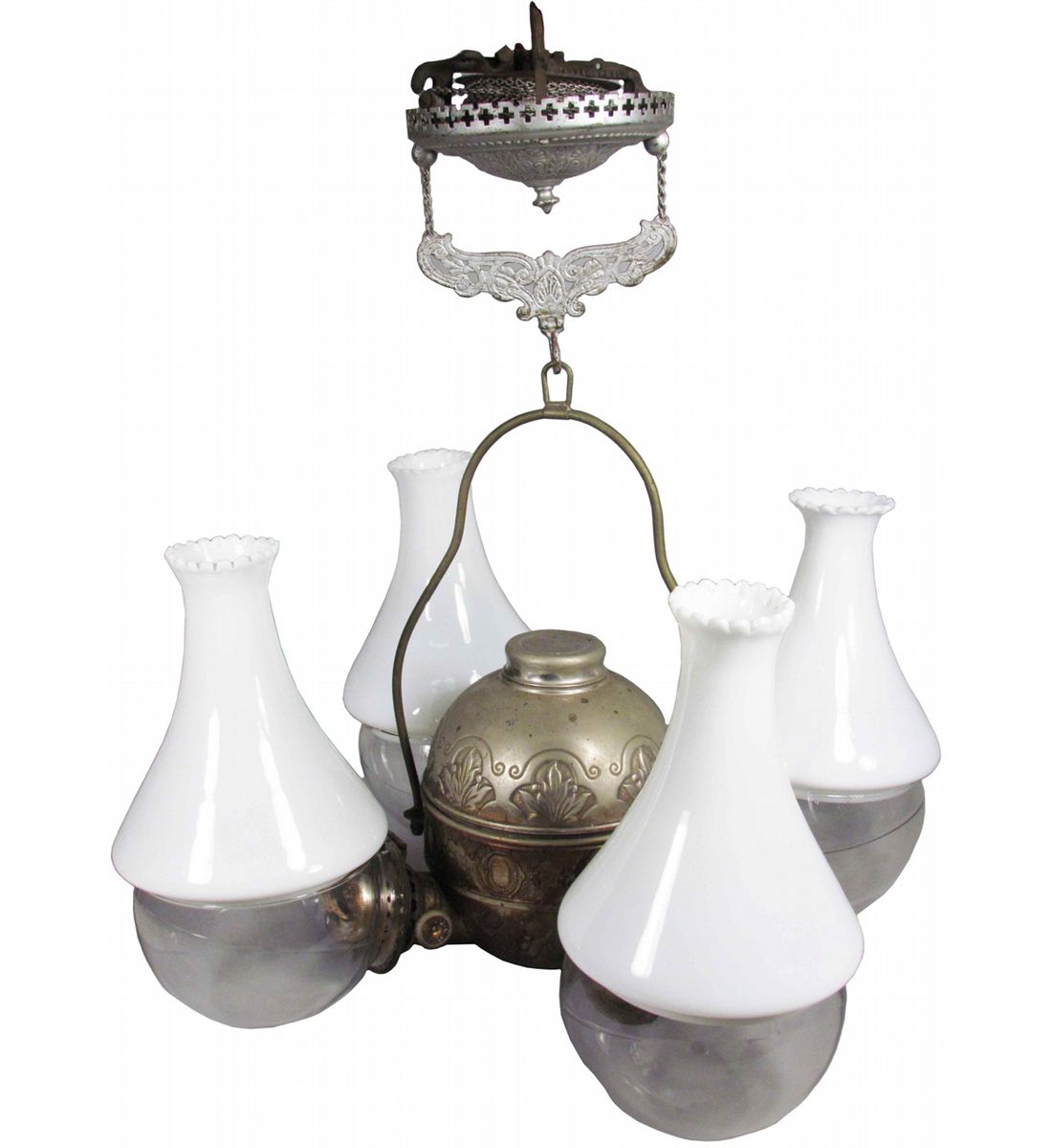 Hanging Quad Angle Lamp by the Angle Lamp Co. NY. Patented in the US. Nickel plated brass with milk glass shades. One shade has a scallop chip otherwise excellent condition.
