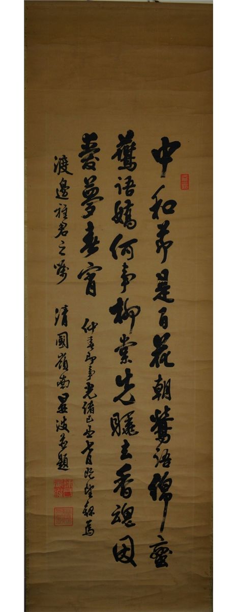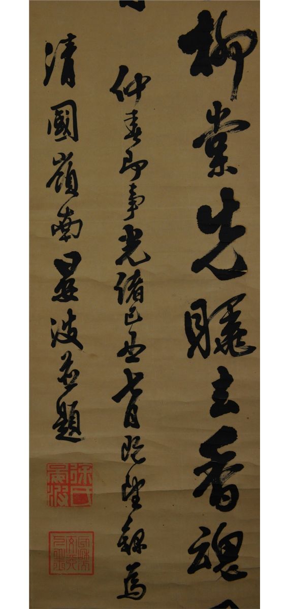 Old Chinese script calligraphy, ink on paper; inscribed and signed with three seals; 149 cm x 47 cm
