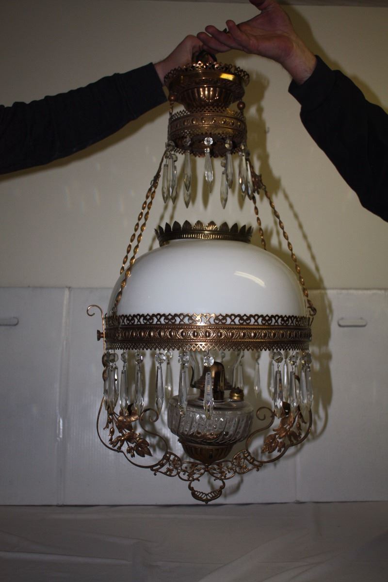 An ornate filigree hanging lamp with its original lamp shade and prisms