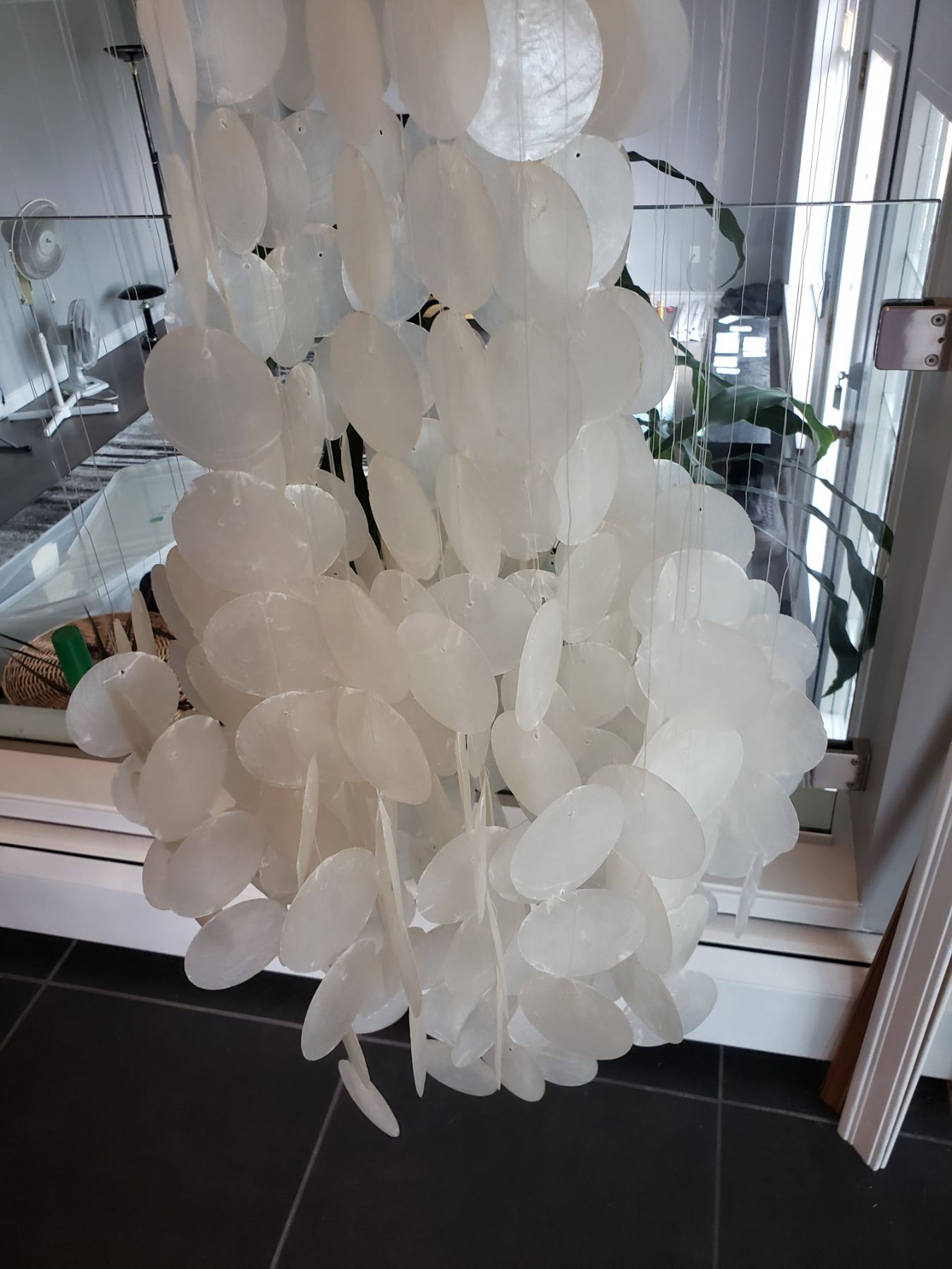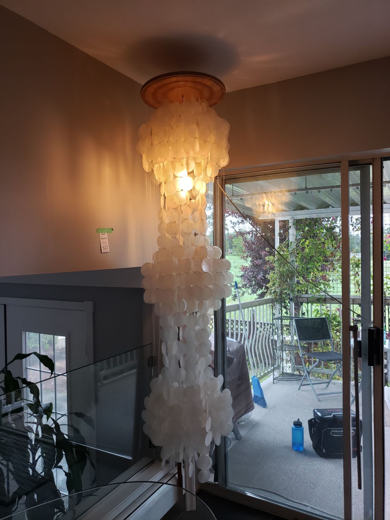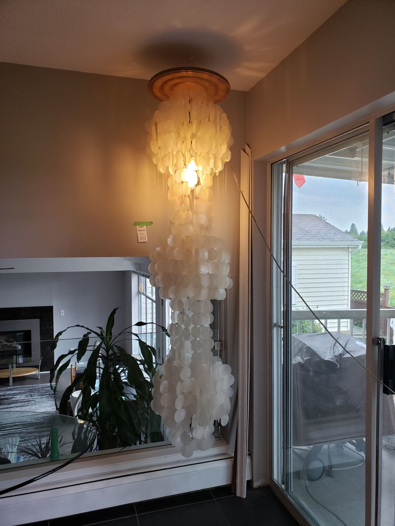 Large hanging lamp with pooka shells, 76” height. Bring help for pickup between 10-11am