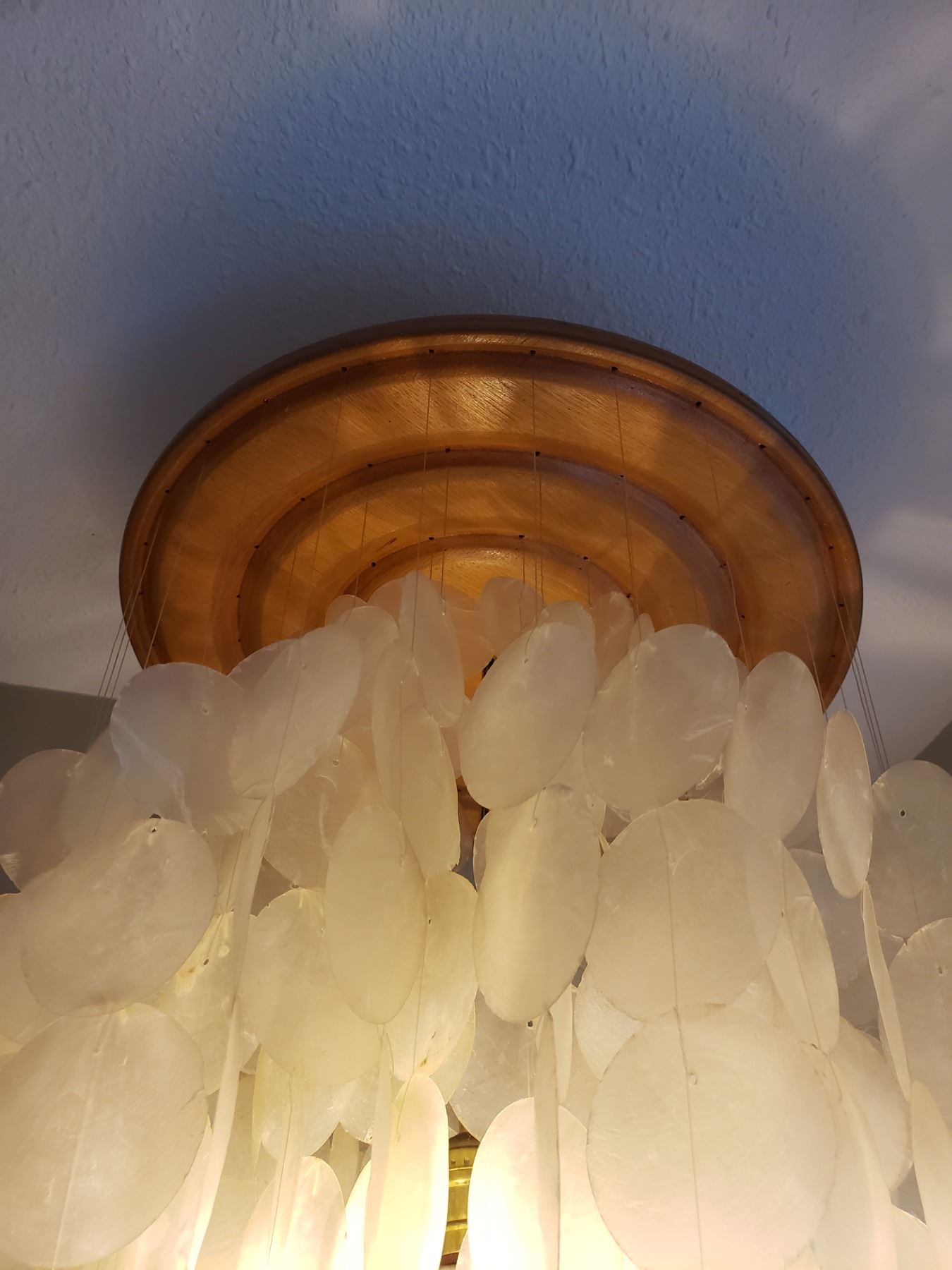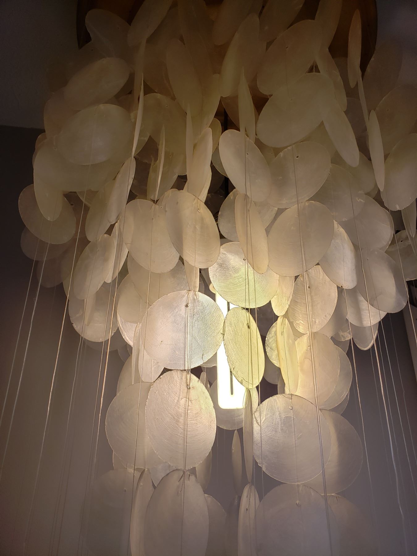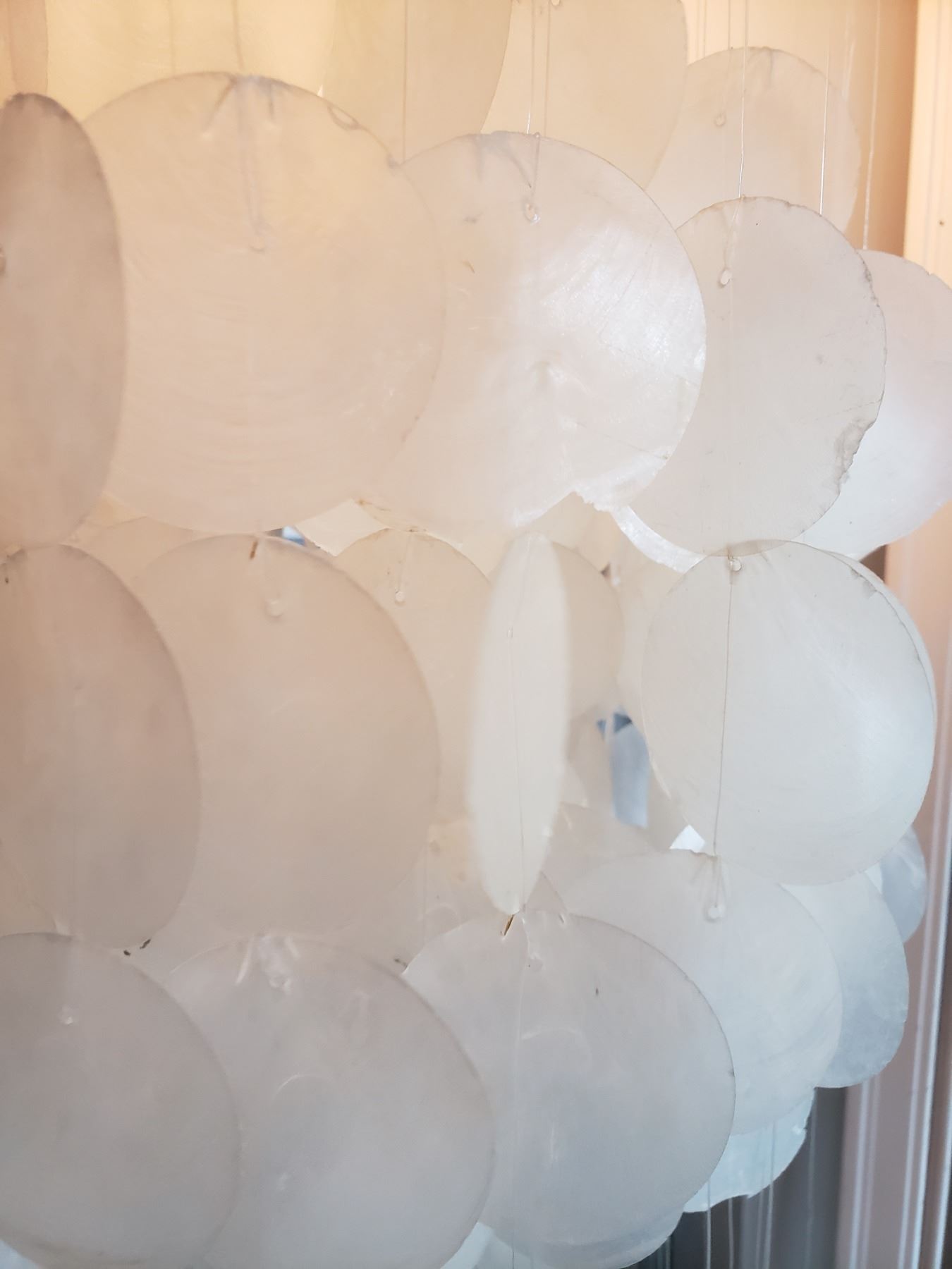 Large hanging lamp with pooka shells, 76” height. Bring help for pickup between 10-11am