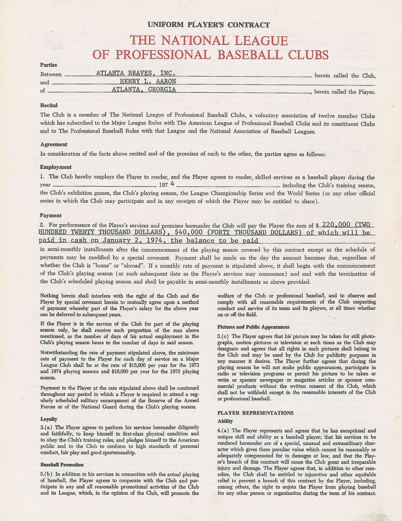 Contract, signed “Henry L. Aaron,” five pages on three adjoining sheets, 8.5 x 11, December 19, 1973. National League uniform player's contract in which Hank Aaron agrees to render "skilled services as a baseball player during the year 1974" for the Atlanta Braves, for a salary of $220,000. Signed at the conclusion in ink by Hank Aaron, National League President Chub Feeney, and Atlanta Braves owner William Bartholomay. Following the 1974 season, Aaron was traded to the Milwaukee Brewers, which is noted in a statement signed by Braves Executive Vice President Eddie Robinson, and in two approval stamps signed by NL President Chub Feeney and AL President Lee MacPhail. The contract also contains a "Special Covenant" addendum concerning a $300,000 loan given to Aaron and guaranteed by the ballclub. In fine condition.
