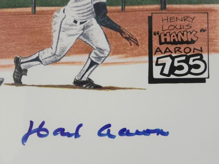 Here are two of the greatest hitters in baseball, and one of them hand-signed this print- Hank Aaron. With an astounding 755 home runs, he beat Babe Ruth, who is also honored here with his 714. * * * * Artist: Jerry Hirsch * Medium: Print on paper * Autographs: Hank Aaron, in blue marker; the artist, in pencil * Edition: 643/750 * Image size: 9 x 12 inches * Framing: In dark red matting in matte black wood frame * Frame size: 14 x 18 inches * Condition: Excellent *