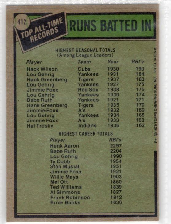 Hank Aaron & Hack Wilson 1979 Topps All Time RBI Records Card number 412
