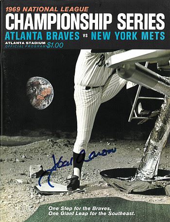 Hank Aaron, a 24 time MLB All-Star, is a home run icon. He started his career in 1954 with the Milwaukee Braves, playing his last 2 years with the Milwaukee Brewers. His amazing knack for hitting home runs and all around ability made him a consensus legend in Cooperstown, NY. Hank Aaron has hand signed this 1969 National League Championship Series Official Program- Atlanta Braves vs New York Mets. Certificate of Authenticity from Athlon Sports Collectibles.