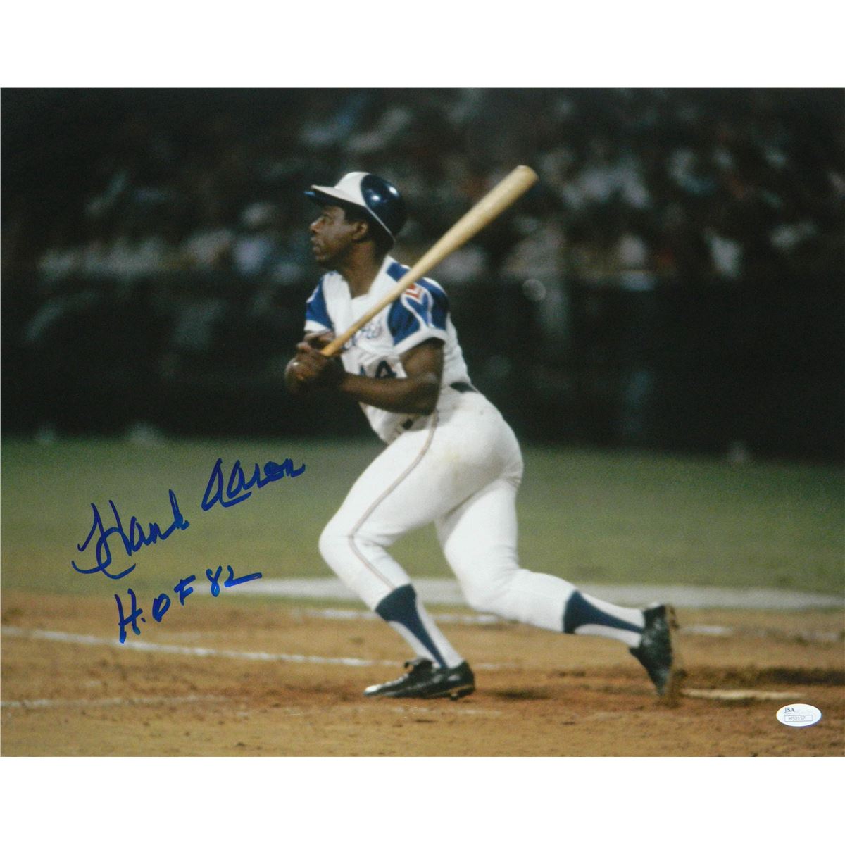 Hank Aaron signed Atlanta Braves close up action 16x20 photo with 'HOF 82' inscription. Item comes with a JSA (James Spence Authentication) tamper evident numbered sticker and matching Certificate of Authenticity which can be verified online.
