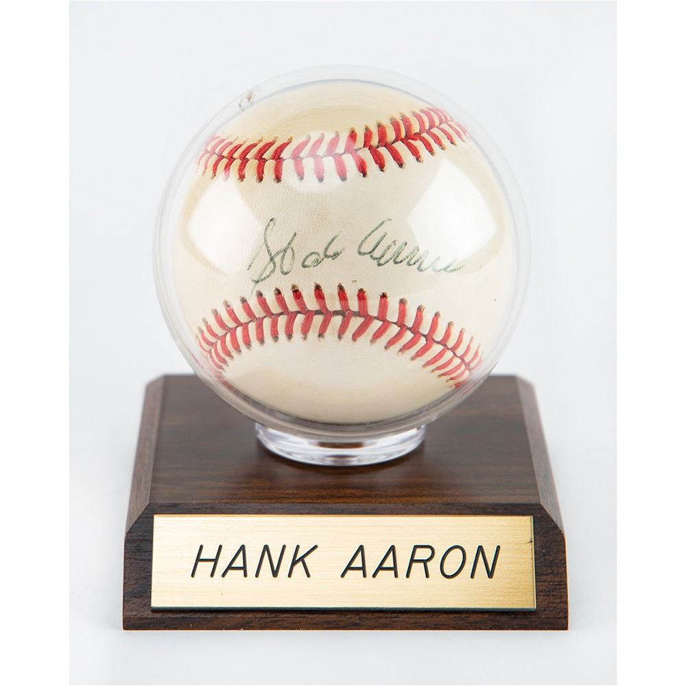 Official Rawlings National League (Giamatti) baseball signed in blue ballpoint on the sweet spot by Hank Aaron. In fine condition, with some faint soiling and light staining.