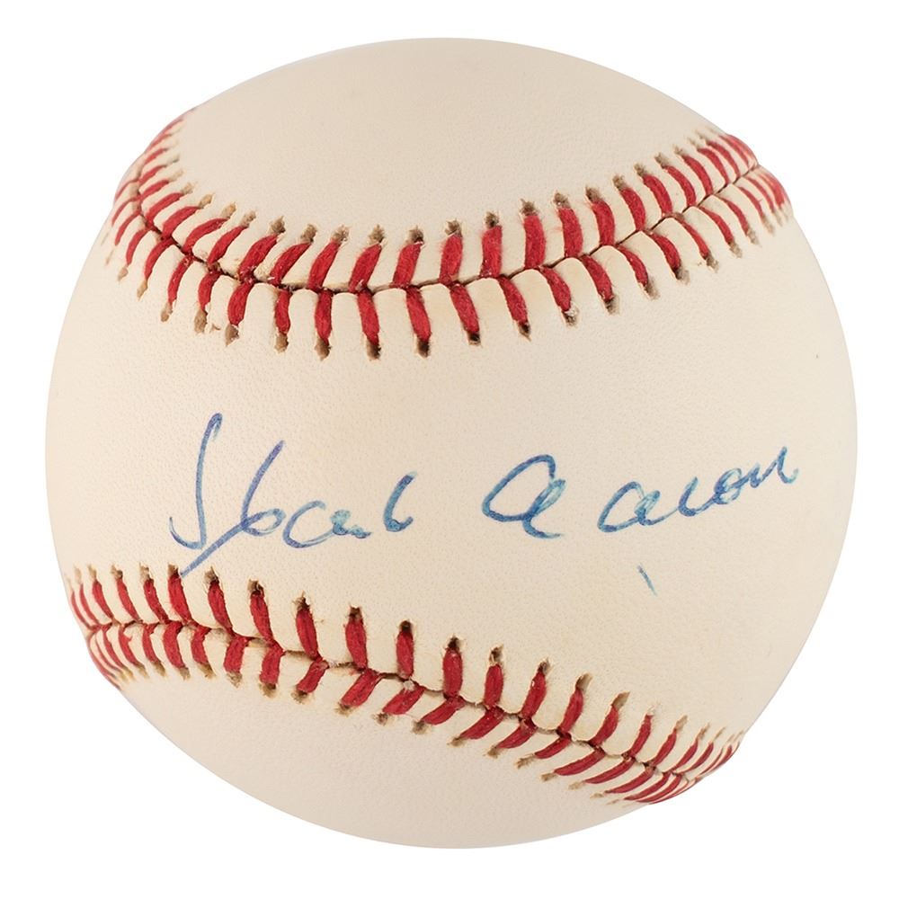 Official Rawlings National League (White) baseball signed in blue ballpoint on the sweet spot, "Hank Aaron." In fine to very fine condition.