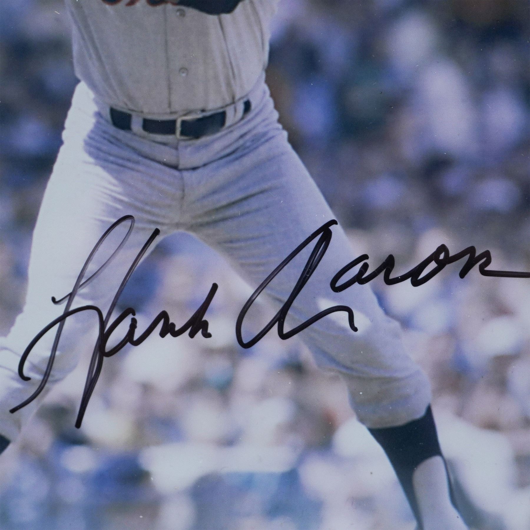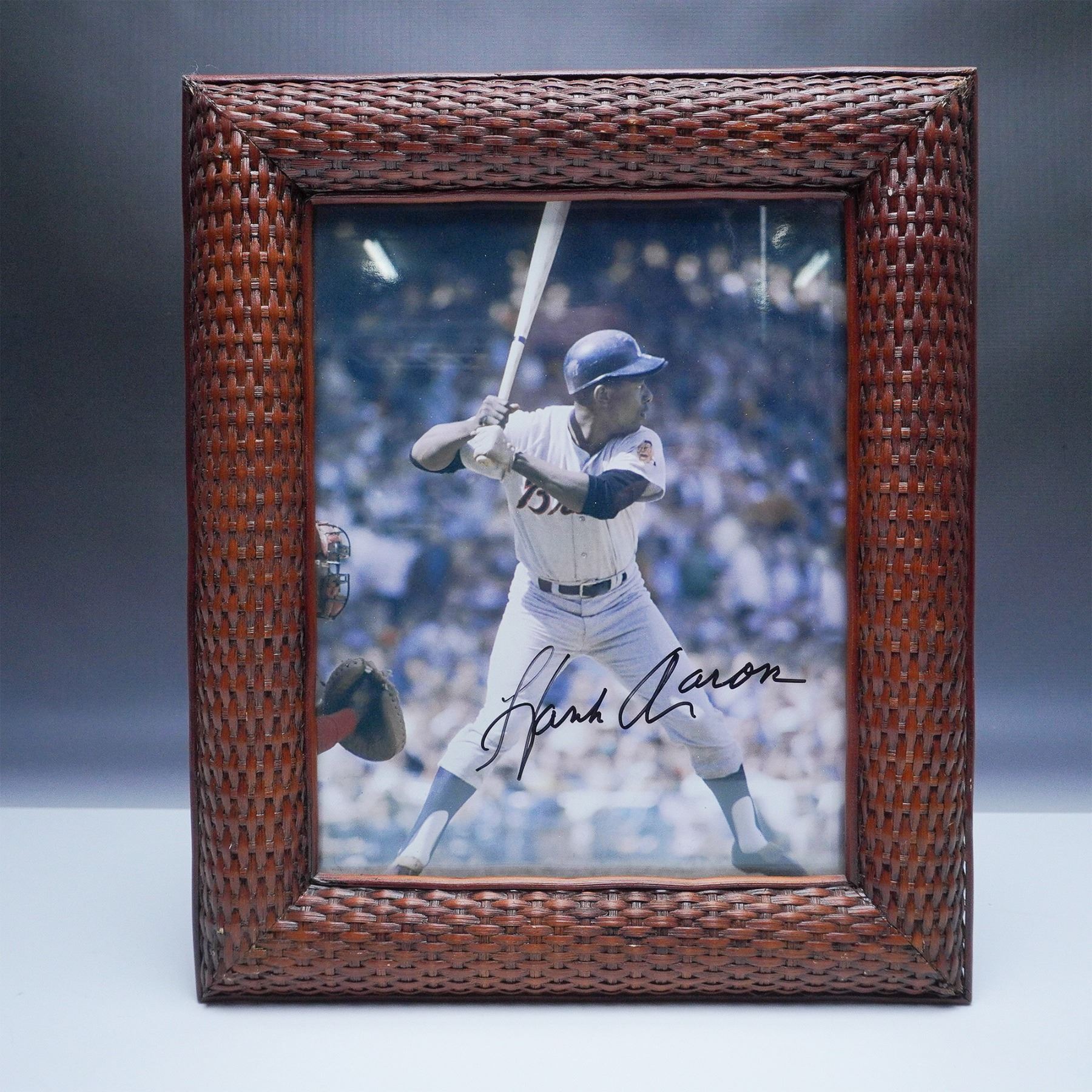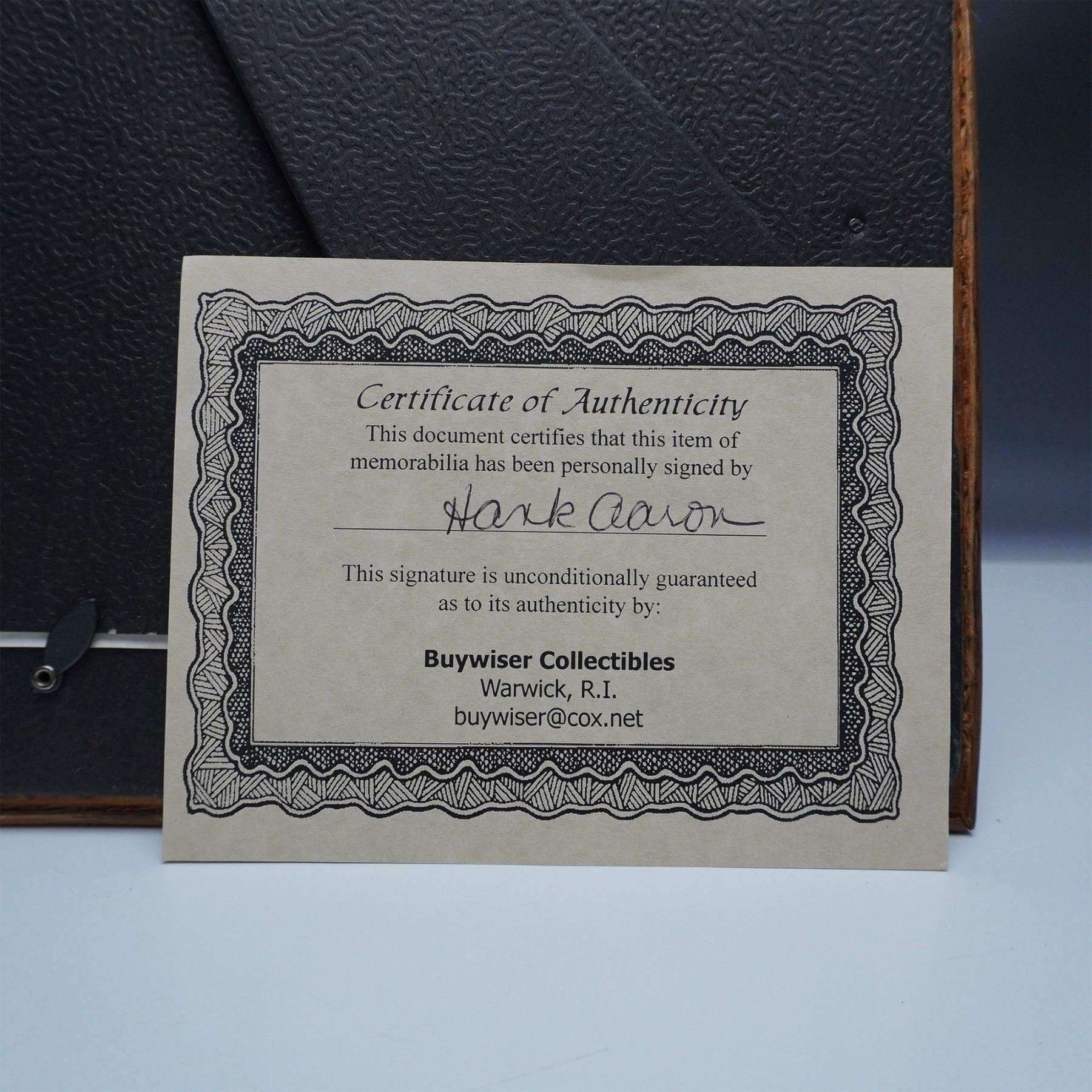 Framed autographed photograph of legendary baseball player Hank Aaron, depicting him at bat in his Milwaukee Braves uniform. The signature, boldly displayed across the lower portion of the image, is authenticated by Buywiser Collectibles, as confirmed by the accompanying Certificate of Authenticity. The photo is encased in a textured wicker-style frame, adding a classic touch to this collectible piece.
