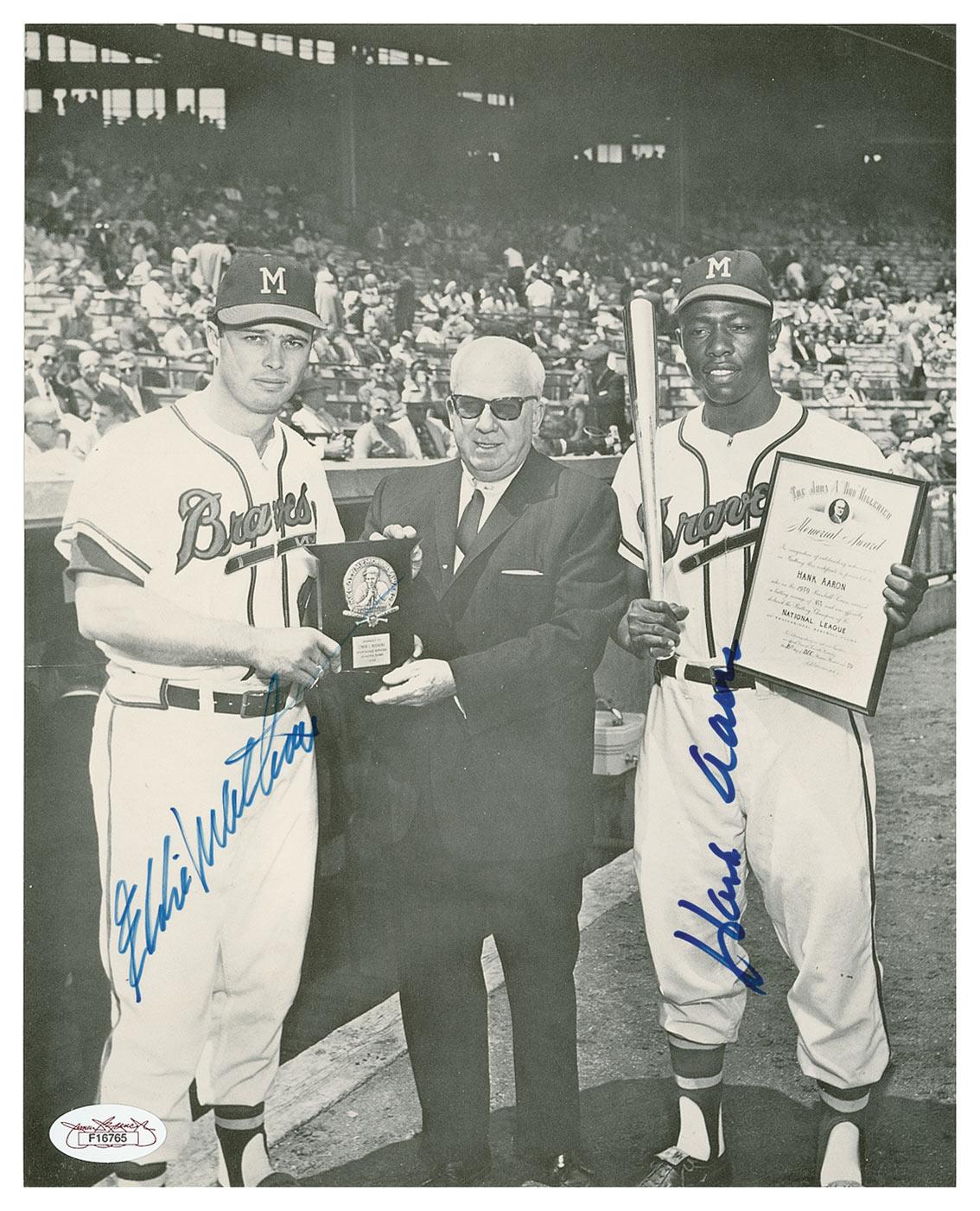 Nice 8 x 10 cardstock photo of teammates Aaron and Mathews being presented with post-season awards, signed in blue felt tip by both. In fine condition, with a James Spence authentication label affixed to lower corner. Accompanied by a certificate of authenticity from James Spence.