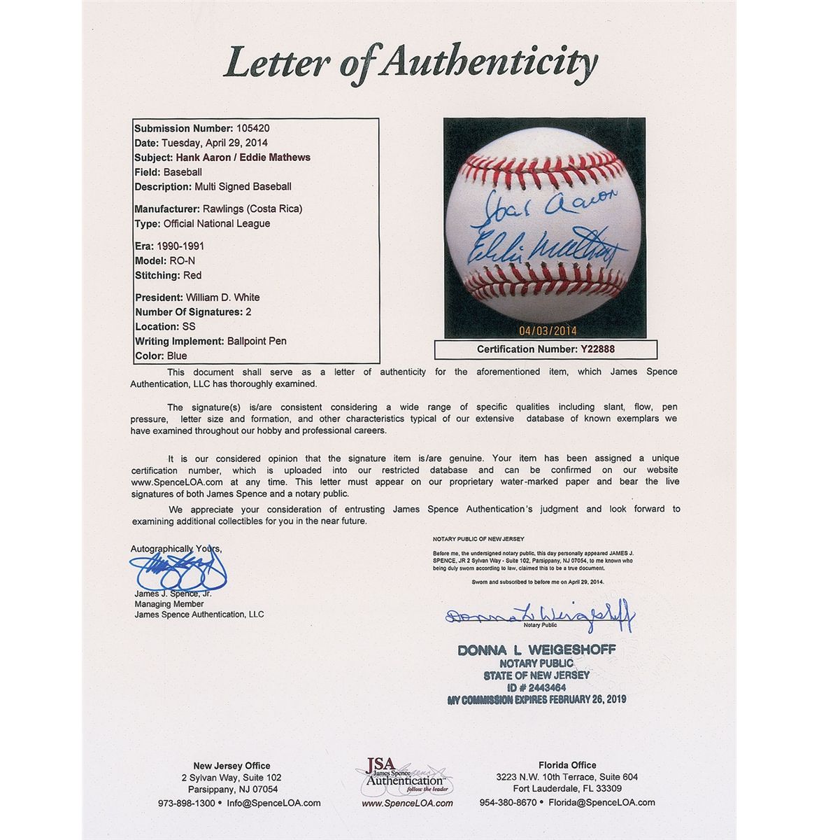 Official Rawlings National League (White) baseball signed in blue ballpoint on the sweet spot by both Hank Aaron and Eddie Mathews. In fine condition, with a JSA label affixed near the league stamp. Accompanied by a full letter of authenticity from JSA.