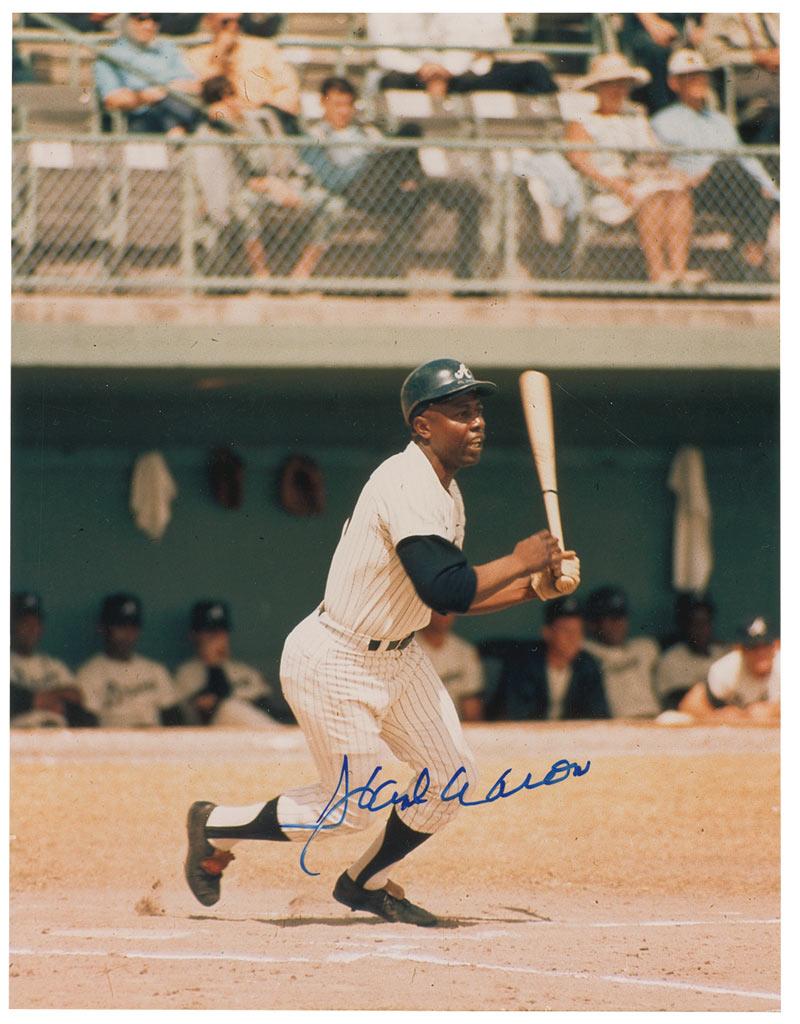 Color glossy 8 x 10 photo of Aaron at bat for the Braves, signed in blue felt tip. In very fine condition.