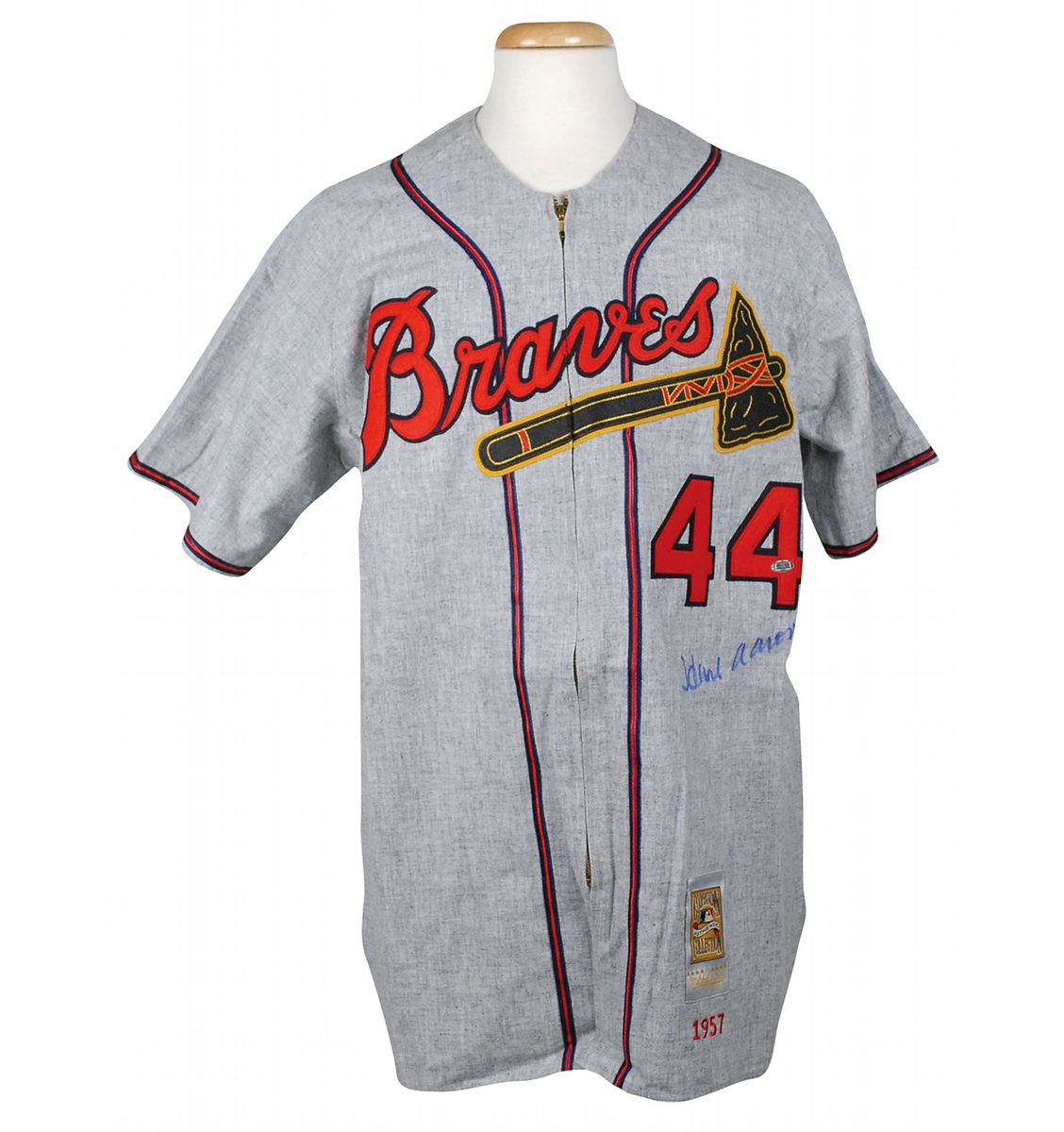 Official Mitchell & Ness Cooperstown Collection replica Milwaukee Braves baseball jersey, with sewn on letters and numbers, signed in blue felt tip on the front. In fine condition, with a Steiner Sports label affixed to the number. Accompanied by a certificate of authenticity from Steiner Sports.