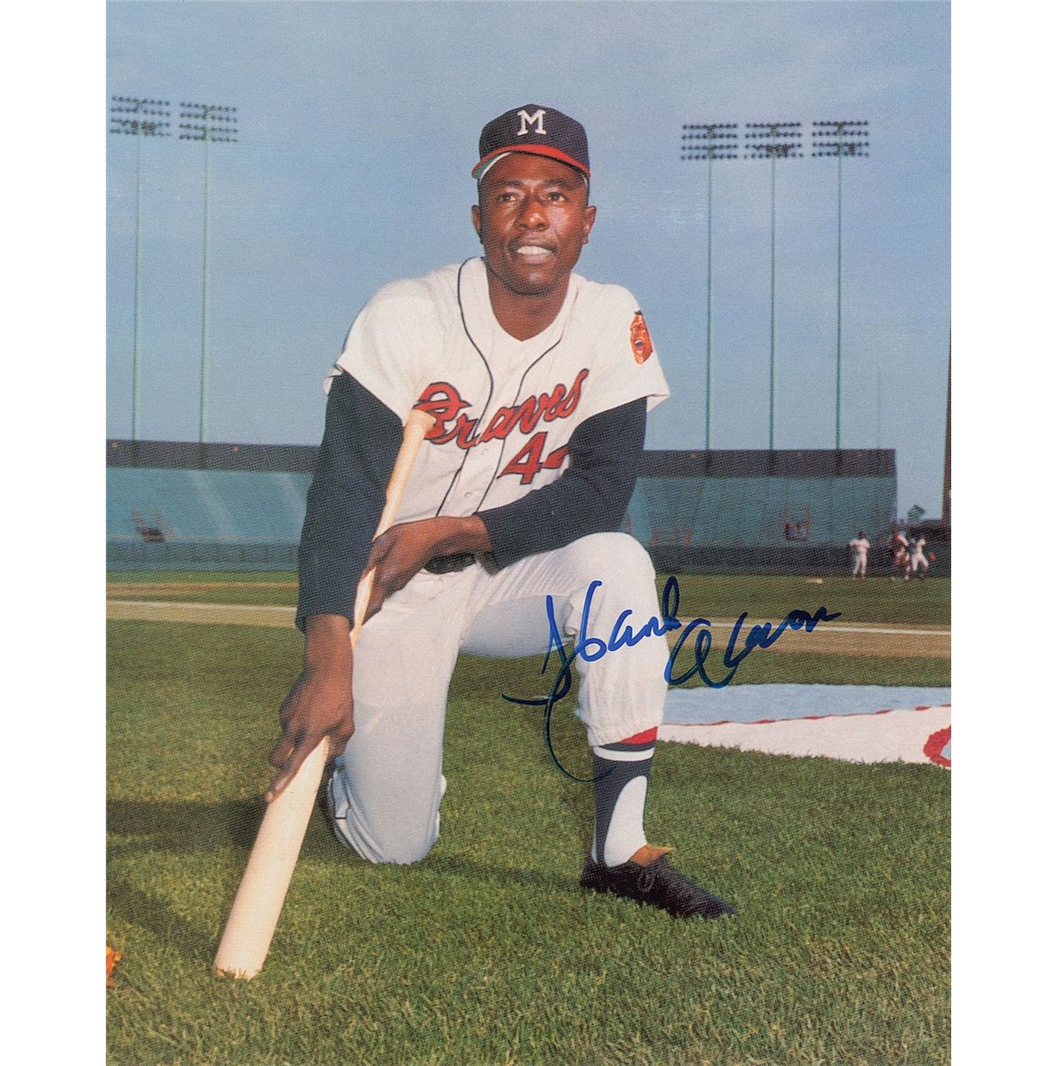 Color 8 x 10 cardstock photo of Aaron while with the Milwaukee Braves, signed in blue felt tip. In fine condition.