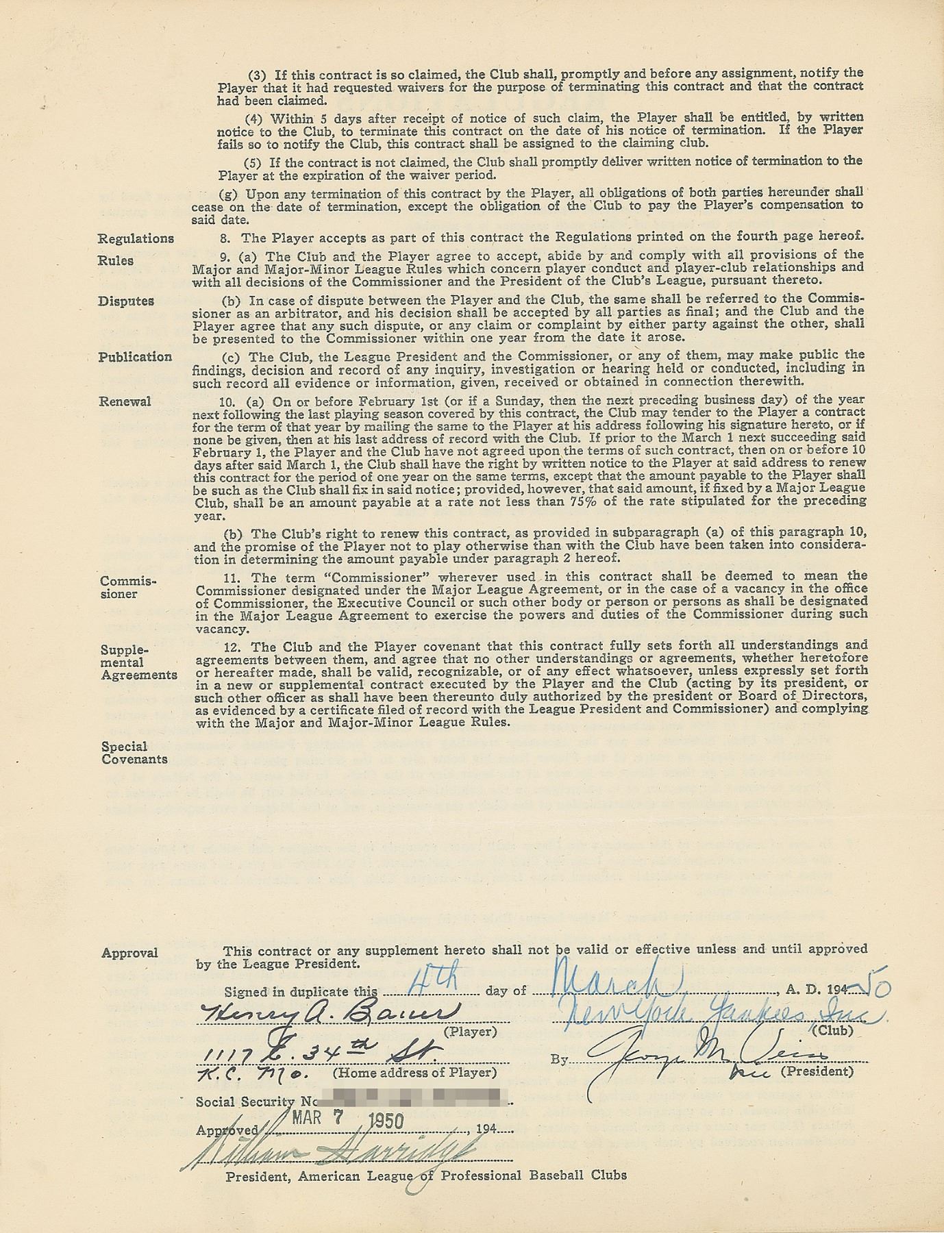 Contract, signed “Henry A. Bauer,” four pages on two adjoining sheets, 8.5 x 11, March 4, 1950. American League uniform player’s contract in which Hank Bauer agrees to render "skilled services as a baseball player during the year of 1950” for the New York Yankees, for a salary of $10,000. Signed at the conclusion in black ink by Bauer, who adds his address and social security number, and countersigned by Yankees General Manager George Weiss and American League President William Harridge. In fine condition, with some light soiling, and adhesive remnant and surface loss to bottom edge of reverse. Bauer appeared in 110 games in the outfield for the Bronx Bombers, and his .320 batting average helped propel them to a World's Championship that fall.