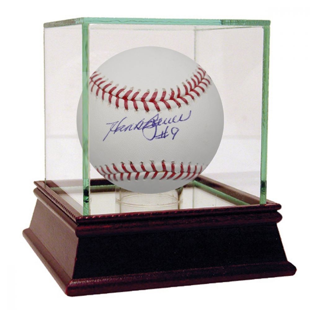 Rawlings Official Major League baseball has been hand-signed in blue ink pen by Hank Bauer (Kansas City Athletics). This auction includes a Steiner display case with a wood base and glass cube.