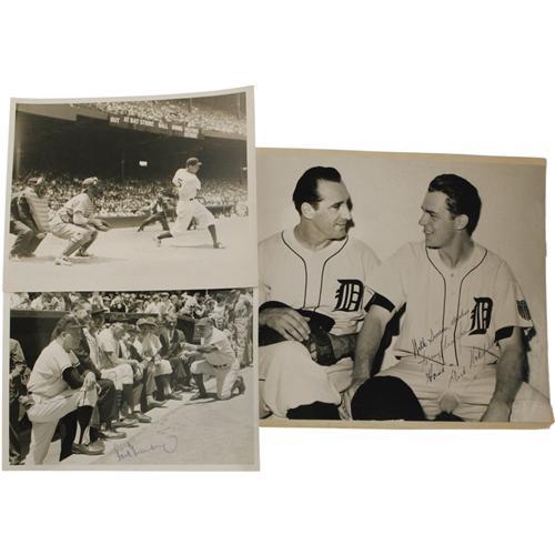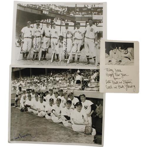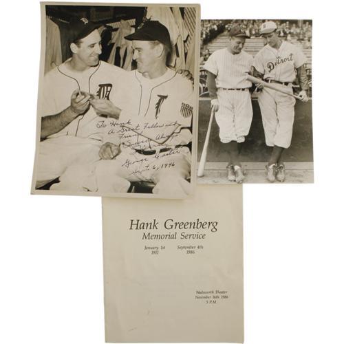 <B>Hank Greenberg Personal Archive with Signed Photographs.</B></I> Vast and varied assortment of photos and documents was acquired by a contractor who had done work on the home of Hank's son and was instructed to dispose of the contents of a closet that held these treasures. Thirty-nine individual pieces comprise this lot, with highlights including:<BR><BR>1) Four photos signed by Greenberg. Autographs 10/10. Photos 8x10", ranging from VG to NRMT.<BR>2) Photos signed by George Caster (personalized to Hank, 1946), Dick Wakefield (personalized to Hank), Charles Gehringer (3), Bob Feller, Babe Herman and former Presidential hopeful Gary Hart. All autographs 8/10 or better. Photos average EX-MT.<BR>3) Approximately twenty-five various unsigned photos. Many are wire photos, both Type 1 and Type 2. Best is a terrific Type 1 1935 wire photo (trimmed to 6x8.5") of Greenberg and Lou Gehrig at Yankee Stadium. Condition averages EX-MT.<BR>4) Unmailed Christmas card (!) from the Greenberg family. 5) 1986 Hank Greenberg funeral program.<BR><BR>Tremendous break down value here, or a chance for a serious Greenberg collector to take an intriguing inside look into the life of this brave baseball hero. <I>LOA from PSA/DNA. LOA from James Spence Authentication.</B></I><BR><BR><b>Shipping:</b> Flat Material, Small (<a target="_blank" href="http://www.heritageauctions.com/common/shipping.php">view shipping information</a>)