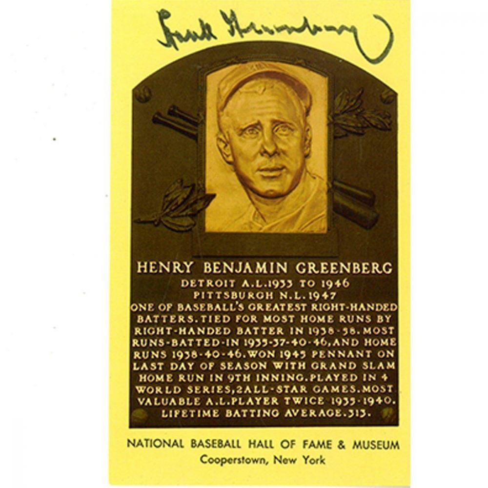 Gold Hall of Fame postcard has been hand-signed in black felt-tip pen by Hank Greenberg (D. 1986, Tigers HOF).