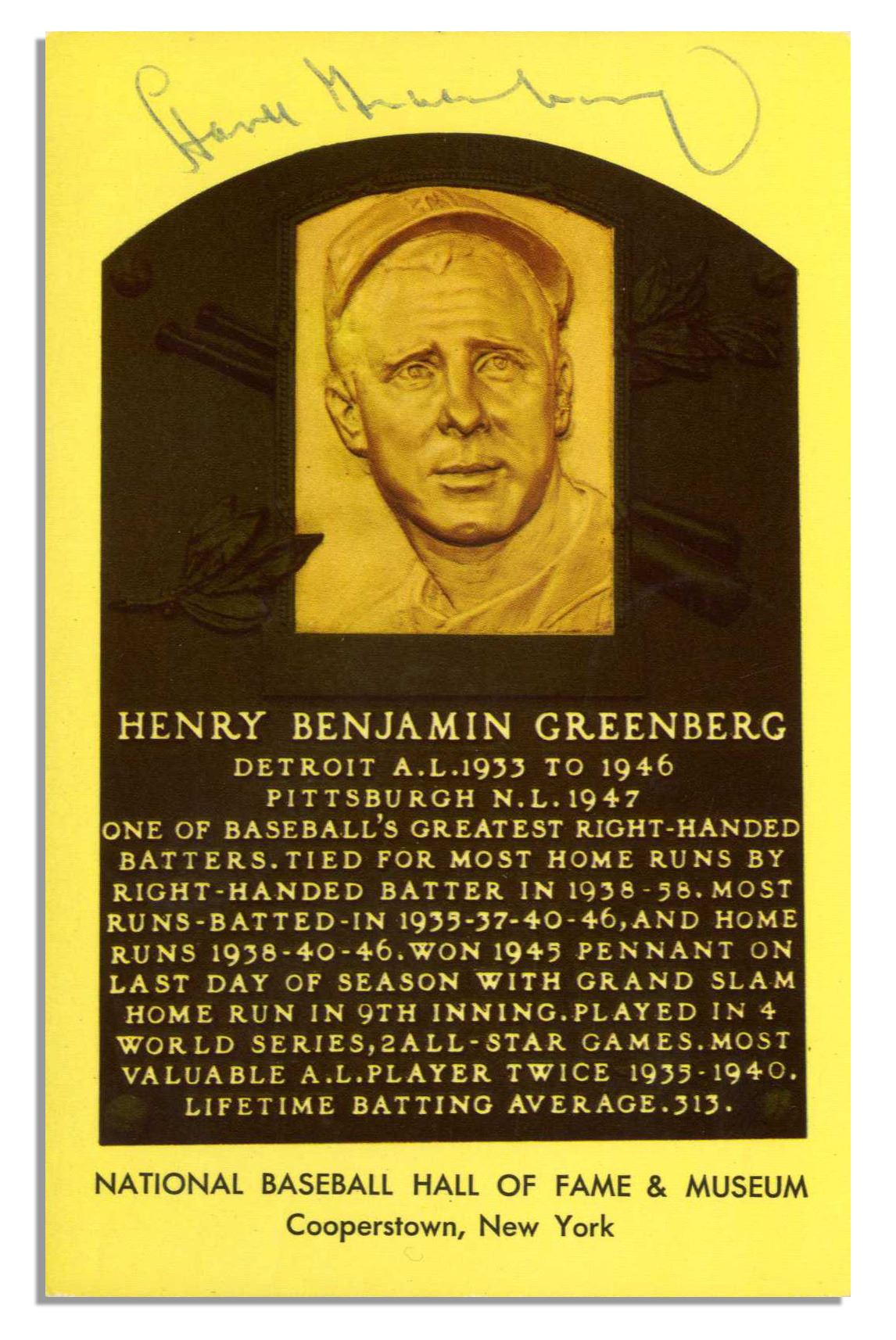 Hank Greenberg postcard signed. The top margin of the card is signed, ''Hank Greenberg'' above an image of Greenberg's plaque at the Baseball Hall of Fame. Card measures 3.5'' x 5.5''. Near fine.